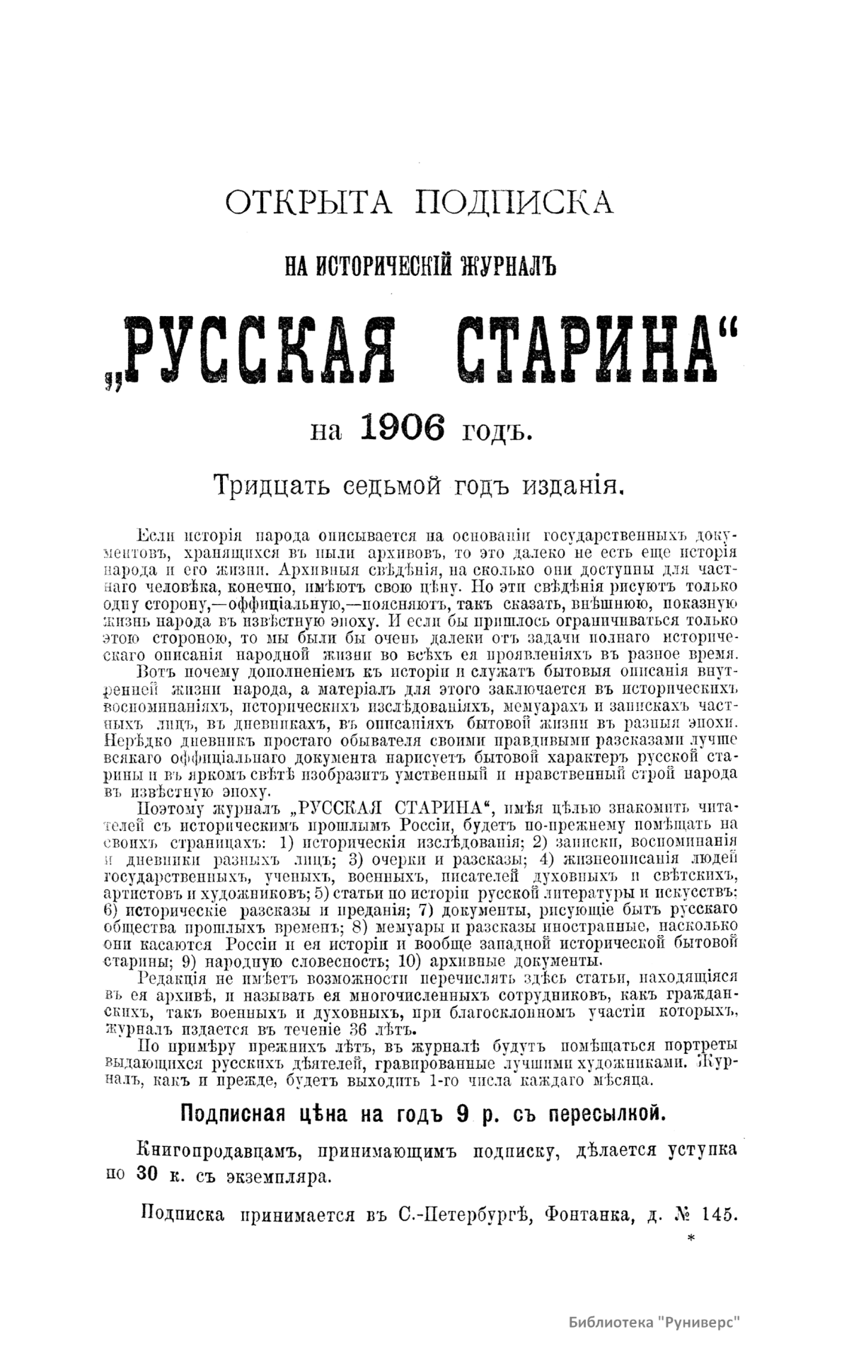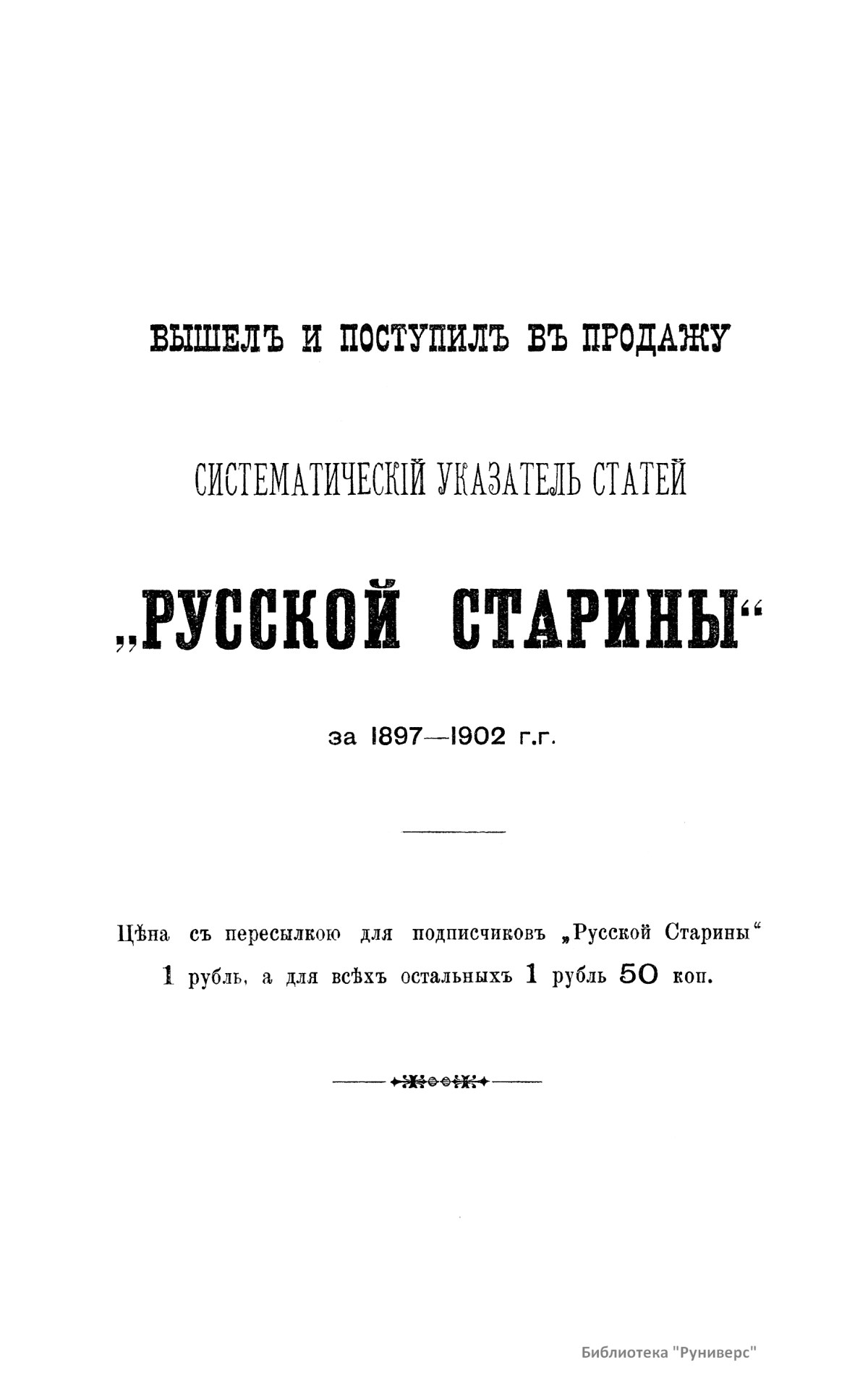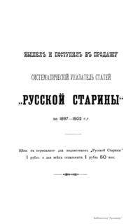 «Русская старина», ежемесячный исторический журнал, выходил в Петербурге в 1870-1918. Основан, издавался и редактировался (1870-1892) М. И. Семевским при участии В. И. Семевского. Последующими редакторами были Н. К. Шильдер (1892-1896), Н. Ф. Дубровин (1896-1904), военные историки С. П. Зыков, П. Н. Воронов.