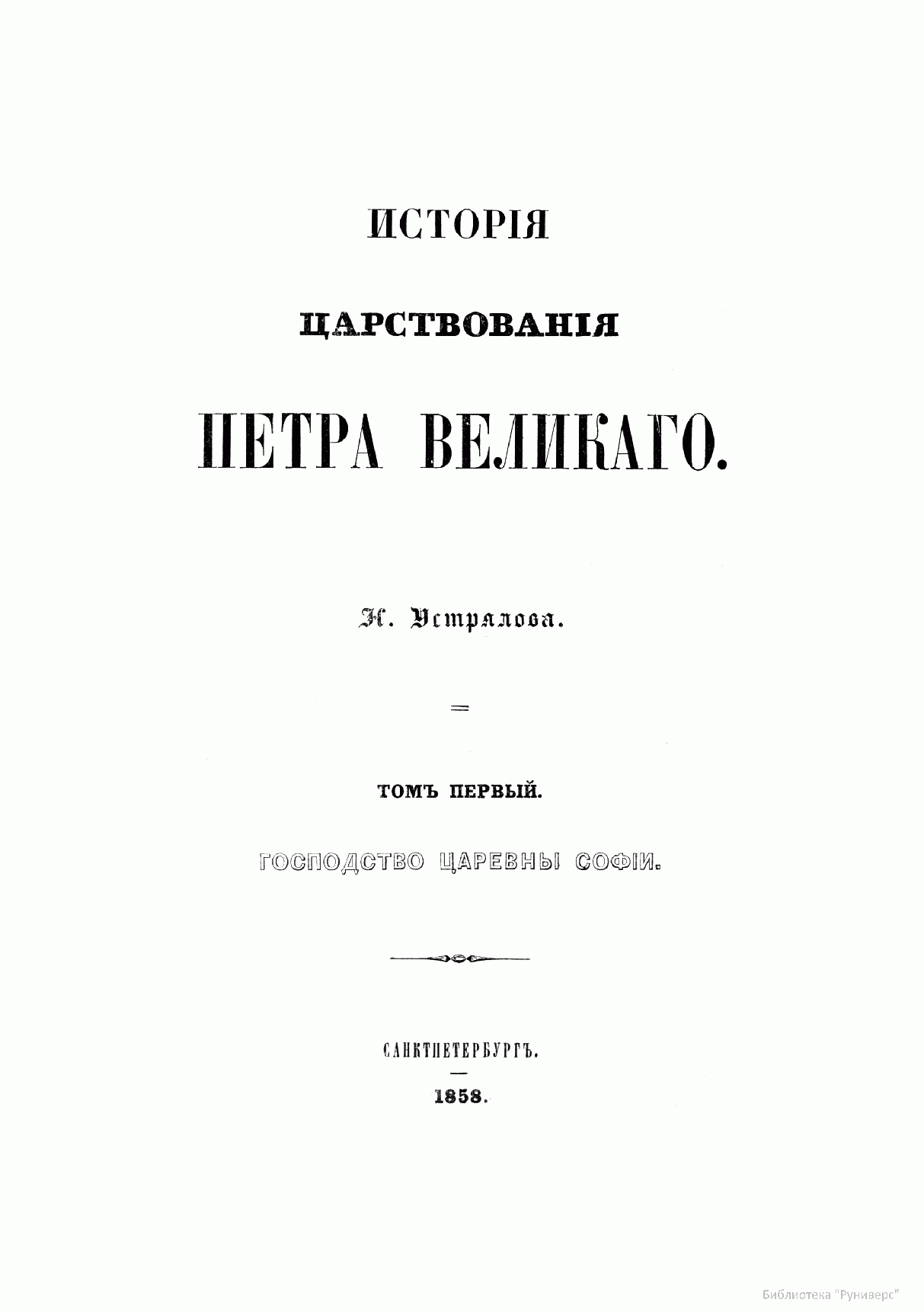 Устрялов Николай Герасимович (1805–1870) — профессор Петербургского университета, академик Императорской Академии наук. Самым важным трудом, которому Устрялов посвятил последние 23 года жизни, была «История царствования Петра Великого». Для ее создания автор использовал множество важных источников из государственного архива. Его труд остался незаконченным, но, несмотря на это, явился крупнейшим историческим исследованием.