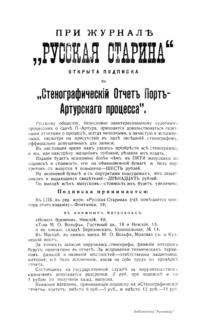 «Русская старина», ежемесячный исторический журнал, выходил в Петербурге в 1870-1918. Основан, издавался и редактировался (1870-1892) М. И. Семевским при участии В. И. Семевского. Последующими редакторами были Н. К. Шильдер (1892-1896), Н. Ф. Дубровин (1896-1904), военные историки С. П. Зыков, П. Н. Воронов.