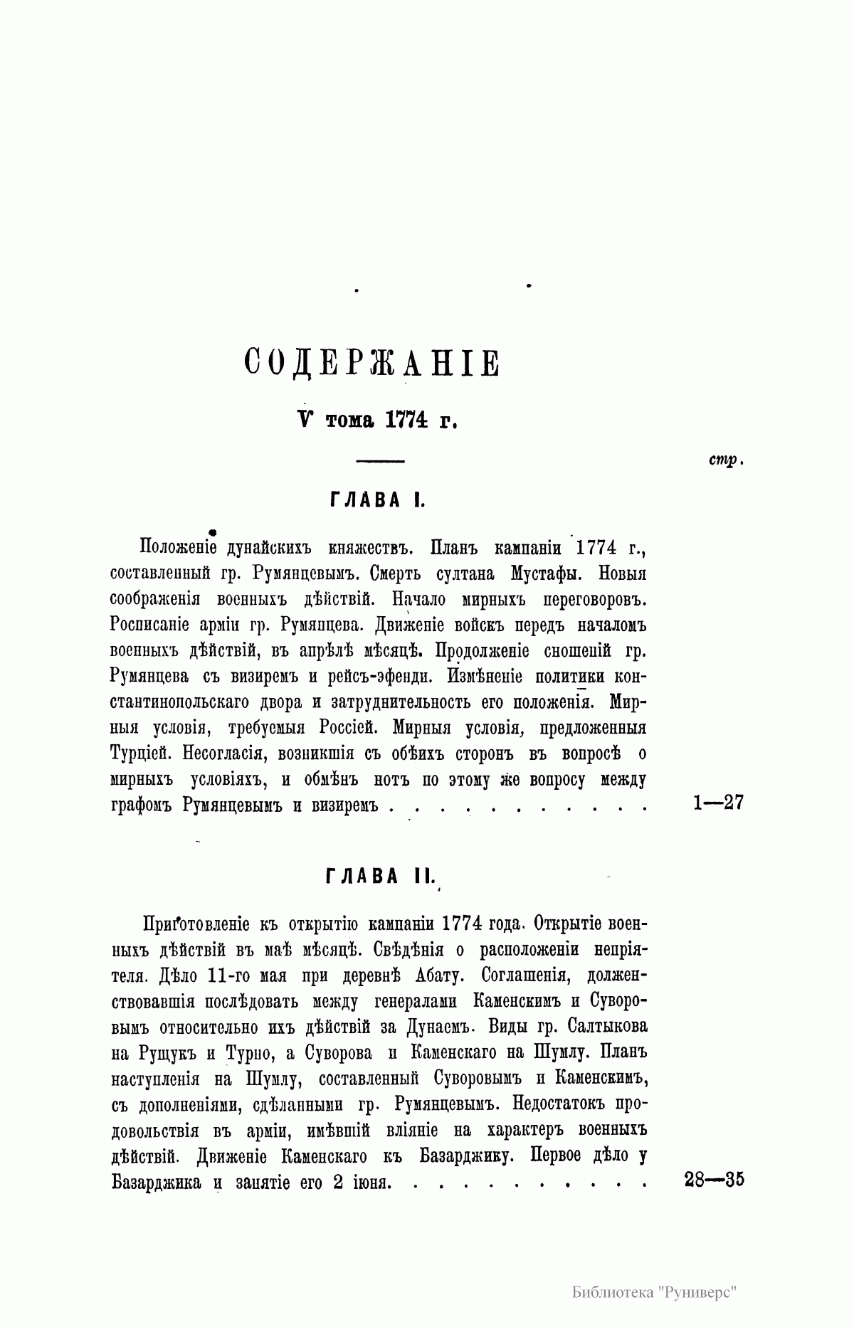 Предпринимая описание первой турецкой войны, в царствование Екатерины II, автор старался изложить военные и политические события того времени с возможною полнотой, насколько это позволяли известные ему рукописные материалы архивов, генерального штаба, государственного и министерства иностранных дел. Петрову посчасливилось одним из первых разбирать дела управления графа Румянцева, только переданные в архив генштаба.