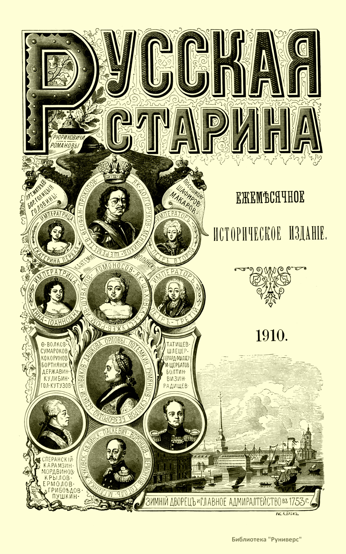 «Русская старина», ежемесячный исторический журнал, выходил в Петербурге в 1870-1918. Основан, издавался и редактировался (1870-1892) М. И. Семевским при участии В. И. Семевского. Последующими редакторами были Н. К. Шильдер (1892-1896), Н. Ф. Дубровин (1896-1904), военные историки С. П. Зыков, П. Н. Воронов.