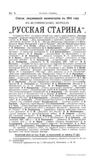 «Русская старина», ежемесячный исторический журнал, выходил в Петербурге в 1870-1918. Основан, издавался и редактировался (1870-1892) М. И. Семевским при участии В. И. Семевского. Последующими редакторами были Н. К. Шильдер (1892-1896), Н. Ф. Дубровин (1896-1904), военные историки С. П. Зыков, П. Н. Воронов.