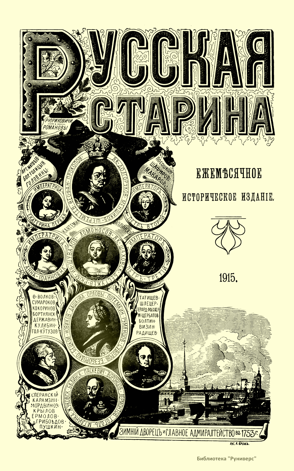 «Русская старина», ежемесячный исторический журнал, выходил в Петербурге в 1870-1918. Основан, издавался и редактировался (1870-1892) М. И. Семевским при участии В. И. Семевского. Последующими редакторами были Н. К. Шильдер (1892-1896), Н. Ф. Дубровин (1896-1904), военные историки С. П. Зыков, П. Н. Воронов.