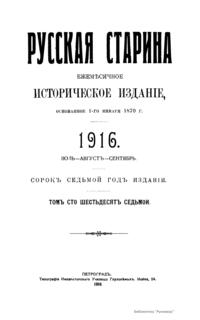 «Русская старина», ежемесячный исторический журнал, выходил в Петербурге в 1870-1918. Основан, издавался и редактировался (1870-1892) М. И. Семевским при участии В. И. Семевского. Последующими редакторами были Н. К. Шильдер (1892-1896), Н. Ф. Дубровин (1896-1904), военные историки С. П. Зыков, П. Н. Воронов.