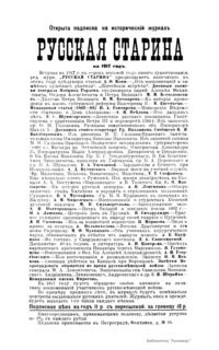 «Русская старина», ежемесячный исторический журнал, выходил в Петербурге в 1870-1918. Основан, издавался и редактировался (1870-1892) М. И. Семевским при участии В. И. Семевского. Последующими редакторами были Н. К. Шильдер (1892-1896), Н. Ф. Дубровин (1896-1904), военные историки С. П. Зыков, П. Н. Воронов.