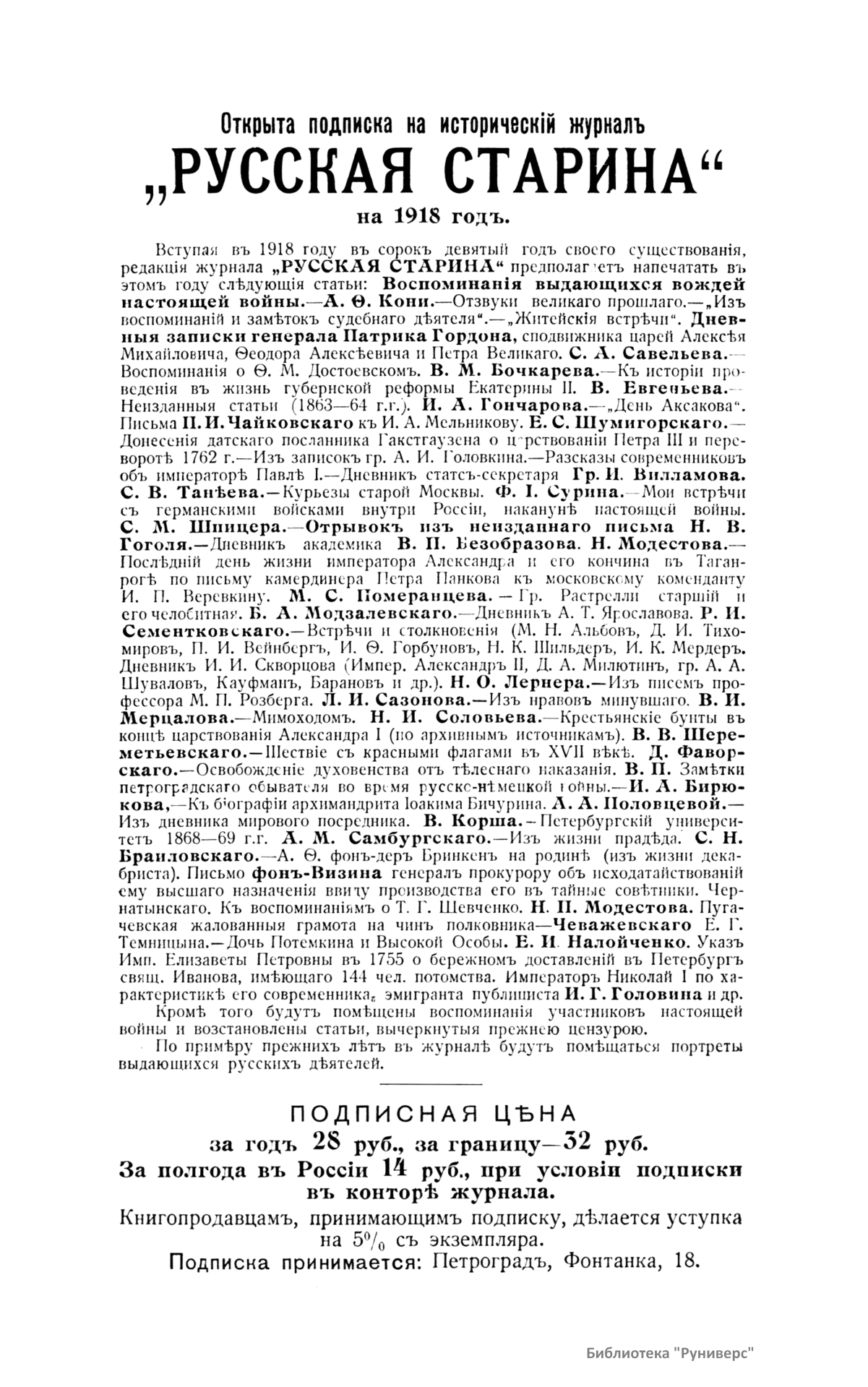 «Русская старина», ежемесячный исторический журнал, выходил в Петербурге в 1870-1918. Основан, издавался и редактировался (1870-1892) М. И. Семевским при участии В. И. Семевского. Последующими редакторами были Н. К. Шильдер (1892-1896), Н. Ф. Дубровин (1896-1904), военные историки С. П. Зыков, П. Н. Воронов.
