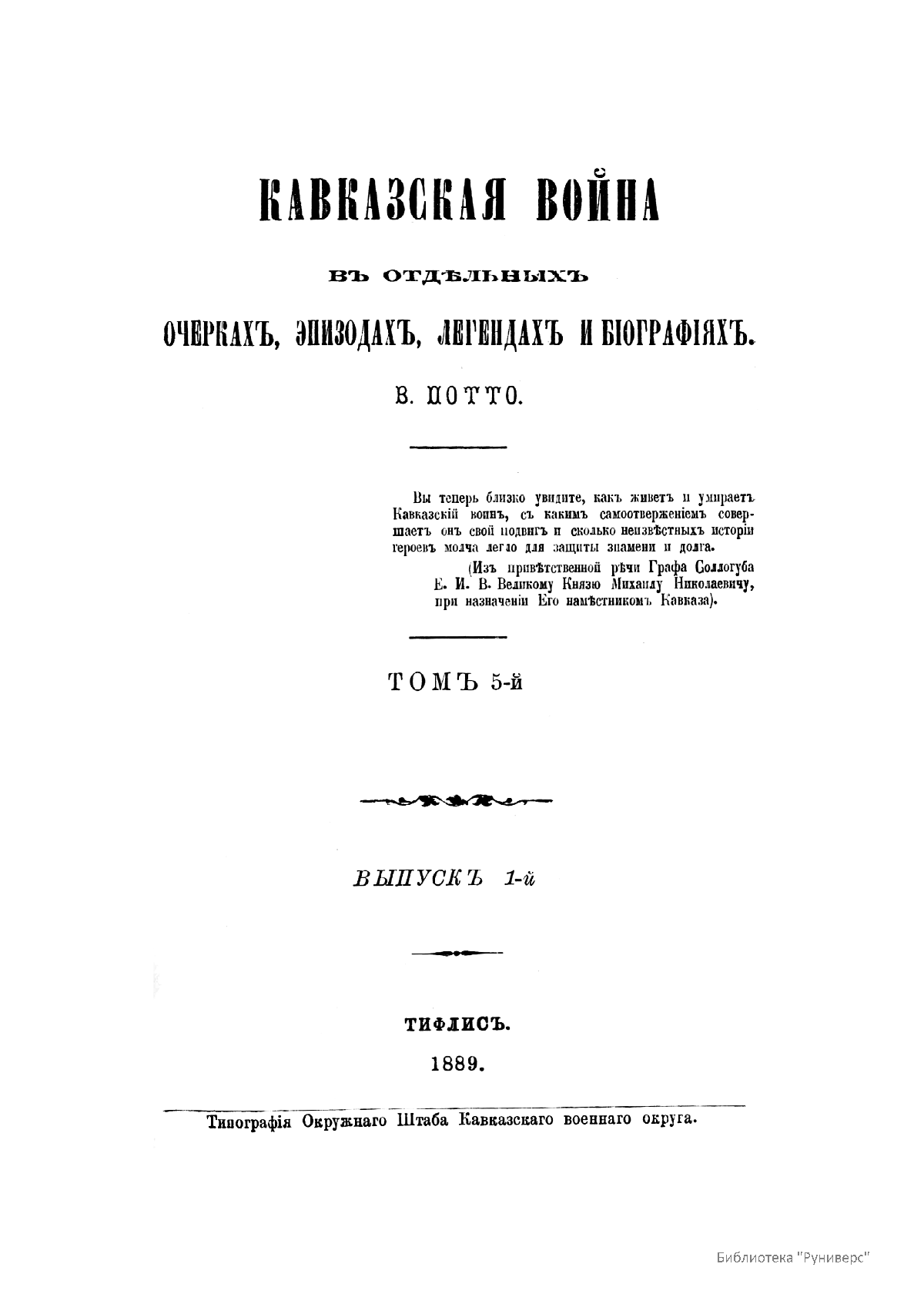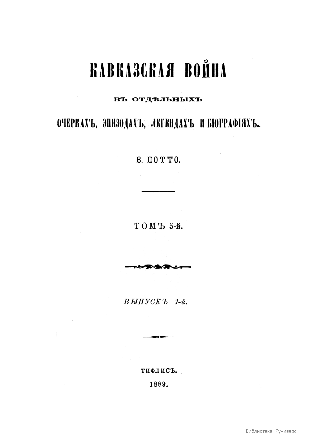 Фундаментальный труд выдающегося военного историка и полководца русской армии охватывает период вооруженного противостояния на Кавказе с начала XVI века по 1831 год. Василий Александрович Потто (1836–1911) — генерал-лейтенант, начальник генерального штаба Кавказской армии, военный историк, посвятивший более полувека подробнейшему изучению, анализу и изложению событий на Кавказе. Его труды, освещающие этапы прихода и становления русской власти в регионе, историю многолетних Кавказских войн и развития казачества, безусловно, обогатили русскую военную литературу и по праву считаются одними из лучших произведений кавказской тематики. Многие годы в разных местах и из бесчисленных источников автор собирал разрозненные документы, военные хроники и архивные материалы, чтобы извлечь из забвения и связать в одно повествование драматические события, ход и развитие которых определили особую роль Кавказской войны в истории российского государства. Каждый том представленного сборника посвящен периоду управления Кавказом того или иного наместника, определенному этапу вооруженного противостояния в этом регионе, военных кампаний под предводительством различных полководцев русской армии. Это военно-историческое исследование было настолько востребовано, что еще до момента выхода в свет последних томов было предпринято второе издание, по которому публикуются первые четыре тома репринтного воспроизведения. Последний пятый том воссоздан по первому изданию сборника (издание типографии окружного штаба Кавказского военного округа).