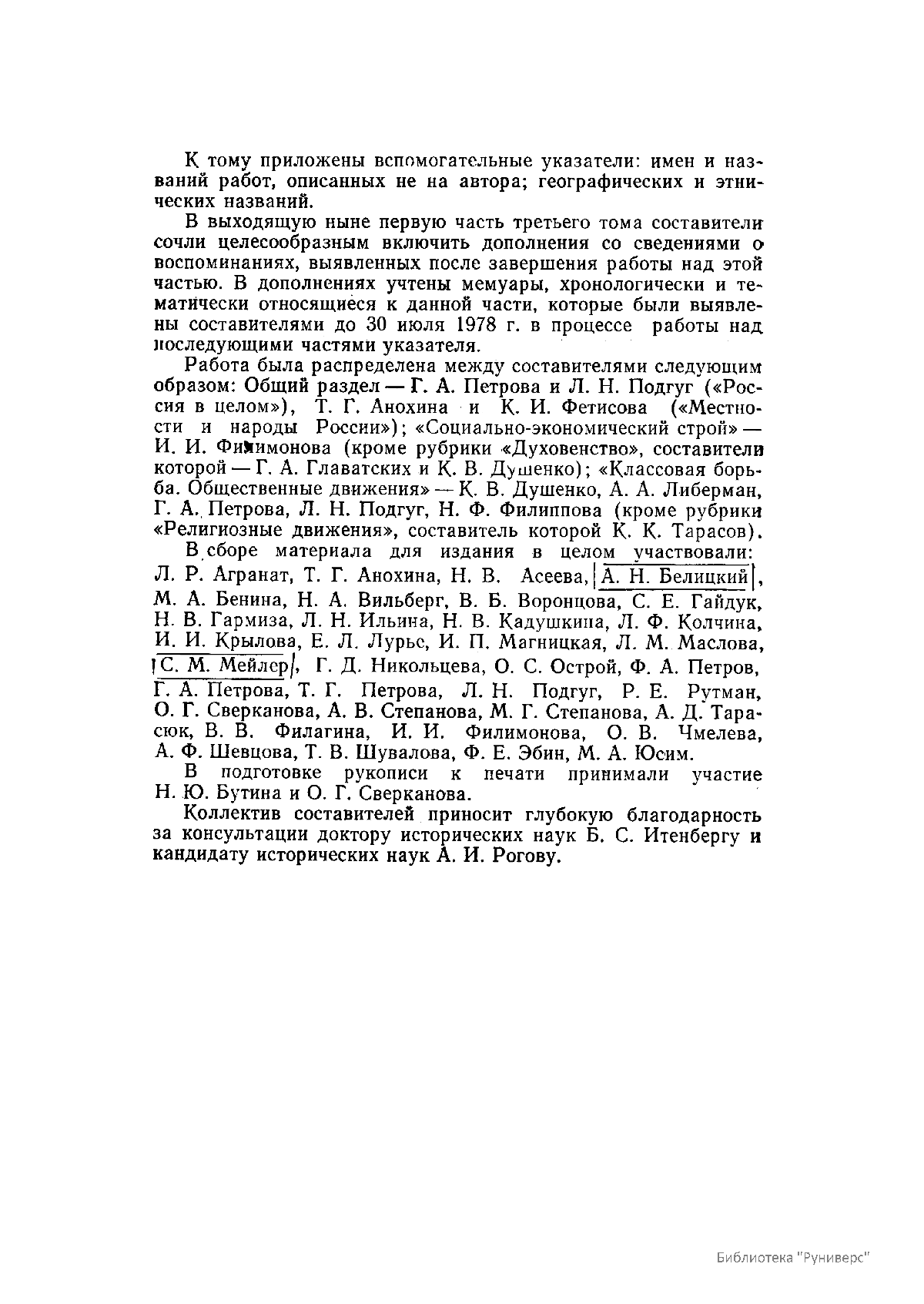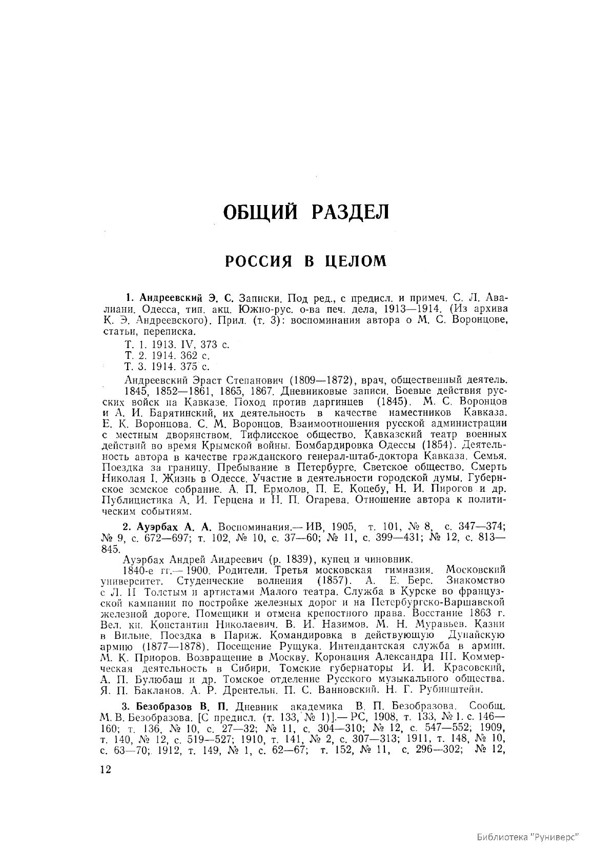 Многотомное издание этого уникального библиографического исследования, ставшего итогом многолетней работы большого коллектива ведущих отечественных источниковедов и библиографов главных библиотек нашей страны, представляет собой крупнейшее собрание аннотированной мемуарной литературы по истории России. Ведущую роль в создании этого фундаментального издания сыграл крупный отечественный ученый-историк П.А. Зайончковский, под редакцией и неусыпным контролем которого разрабатывался и выходил представленный многотомник (последние 5 книг вышли после кончины этого замечательного учёного-энциклопедиста).