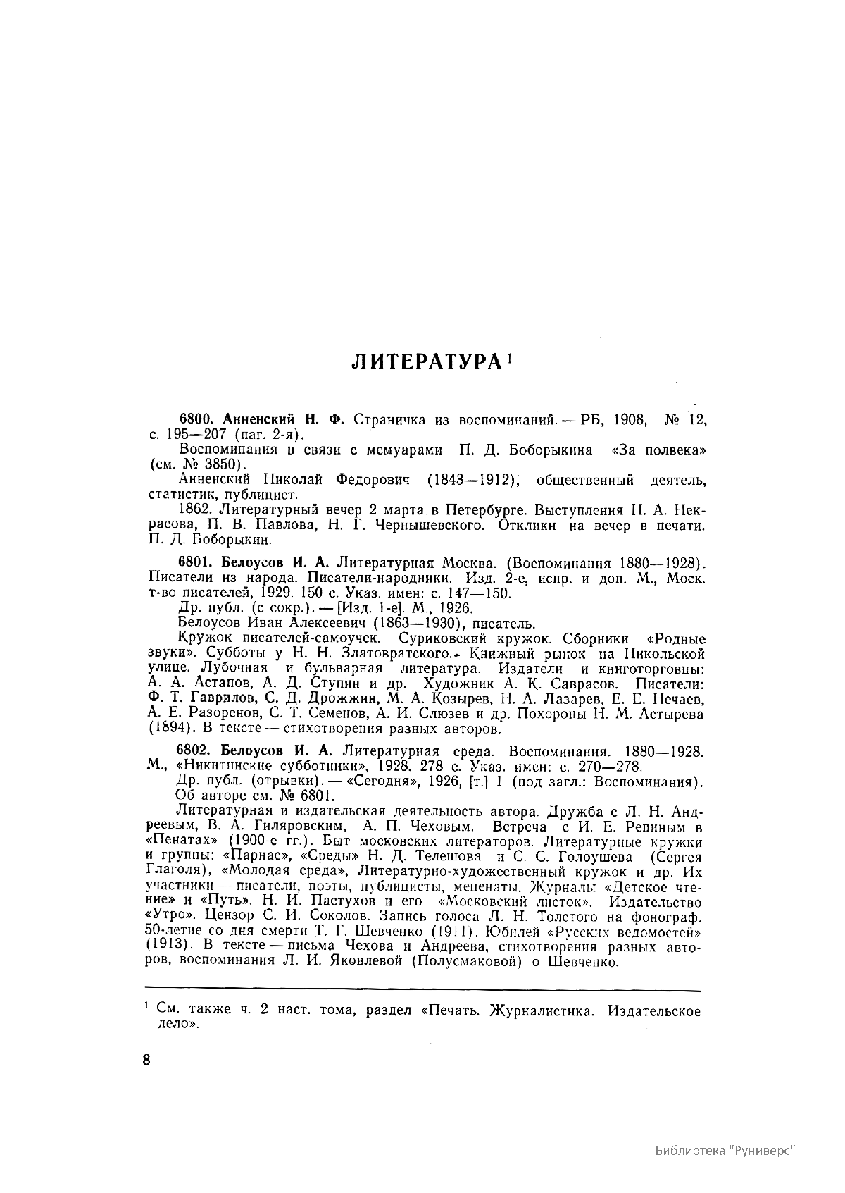 Многотомное издание этого уникального библиографического исследования, ставшего итогом многолетней работы большого коллектива ведущих отечественных источниковедов и библиографов главных библиотек нашей страны, представляет собой крупнейшее собрание аннотированной мемуарной литературы по истории России. Ведущую роль в создании этого фундаментального издания сыграл крупный отечественный ученый-историк П.А. Зайончковский, под редакцией и неусыпным контролем которого разрабатывался и выходил представленный многотомник (последние 5 книг вышли после кончины этого замечательного учёного-энциклопедиста).