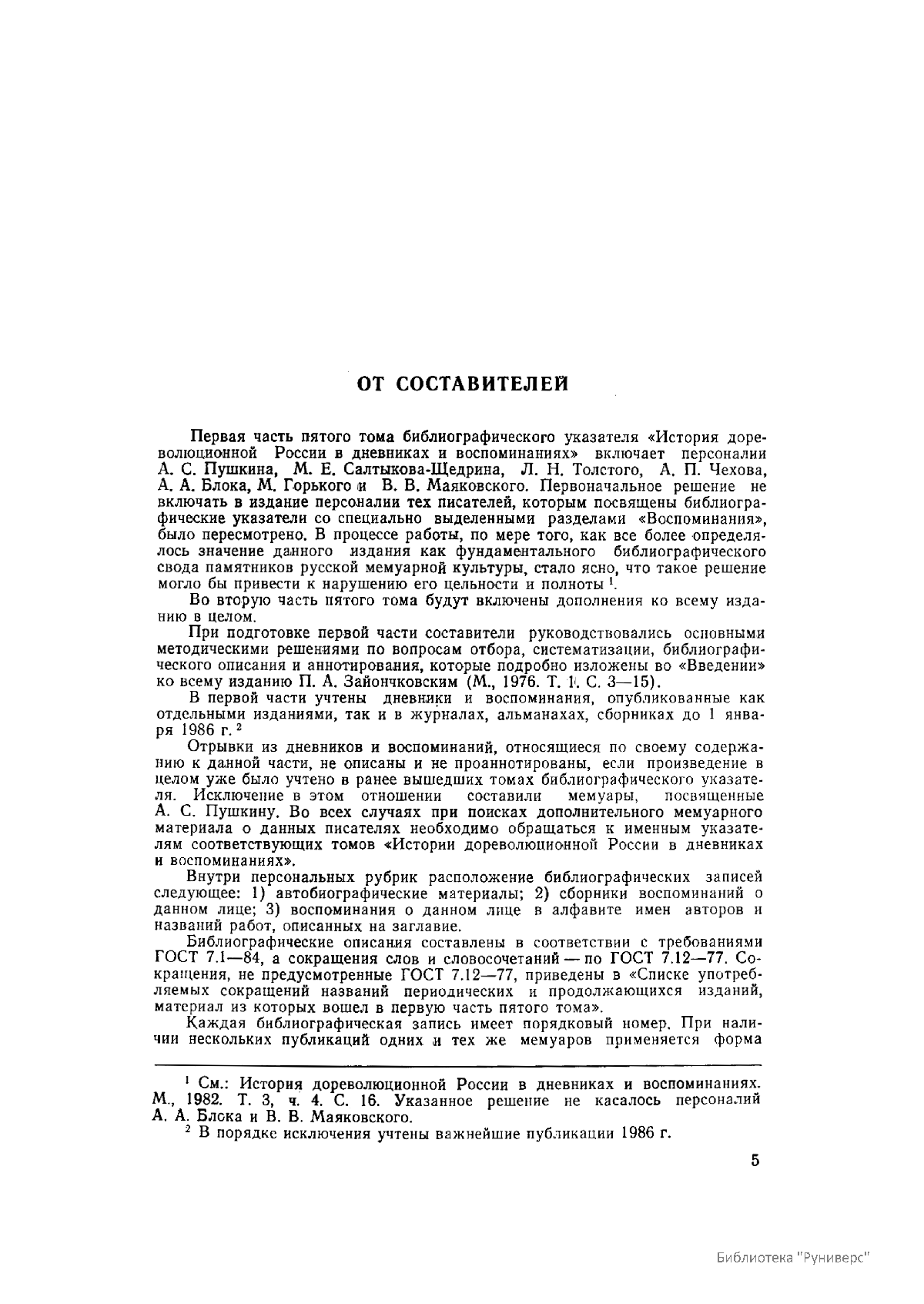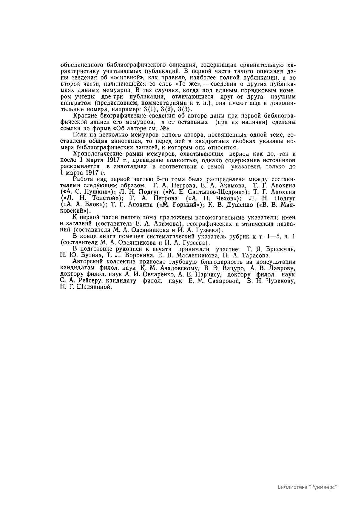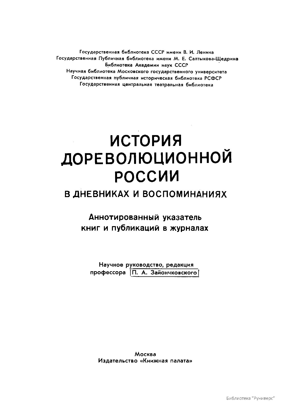 Многотомное издание этого уникального библиографического исследования, ставшего итогом многолетней работы большого коллектива ведущих отечественных источниковедов и библиографов главных библиотек нашей страны, представляет собой крупнейшее собрание аннотированной мемуарной литературы по истории России. Ведущую роль в создании этого фундаментального издания сыграл крупный отечественный ученый-историк П.А. Зайончковский, под редакцией и неусыпным контролем которого разрабатывался и выходил представленный многотомник (последние 5 книг вышли после кончины этого замечательного учёного-энциклопедиста).