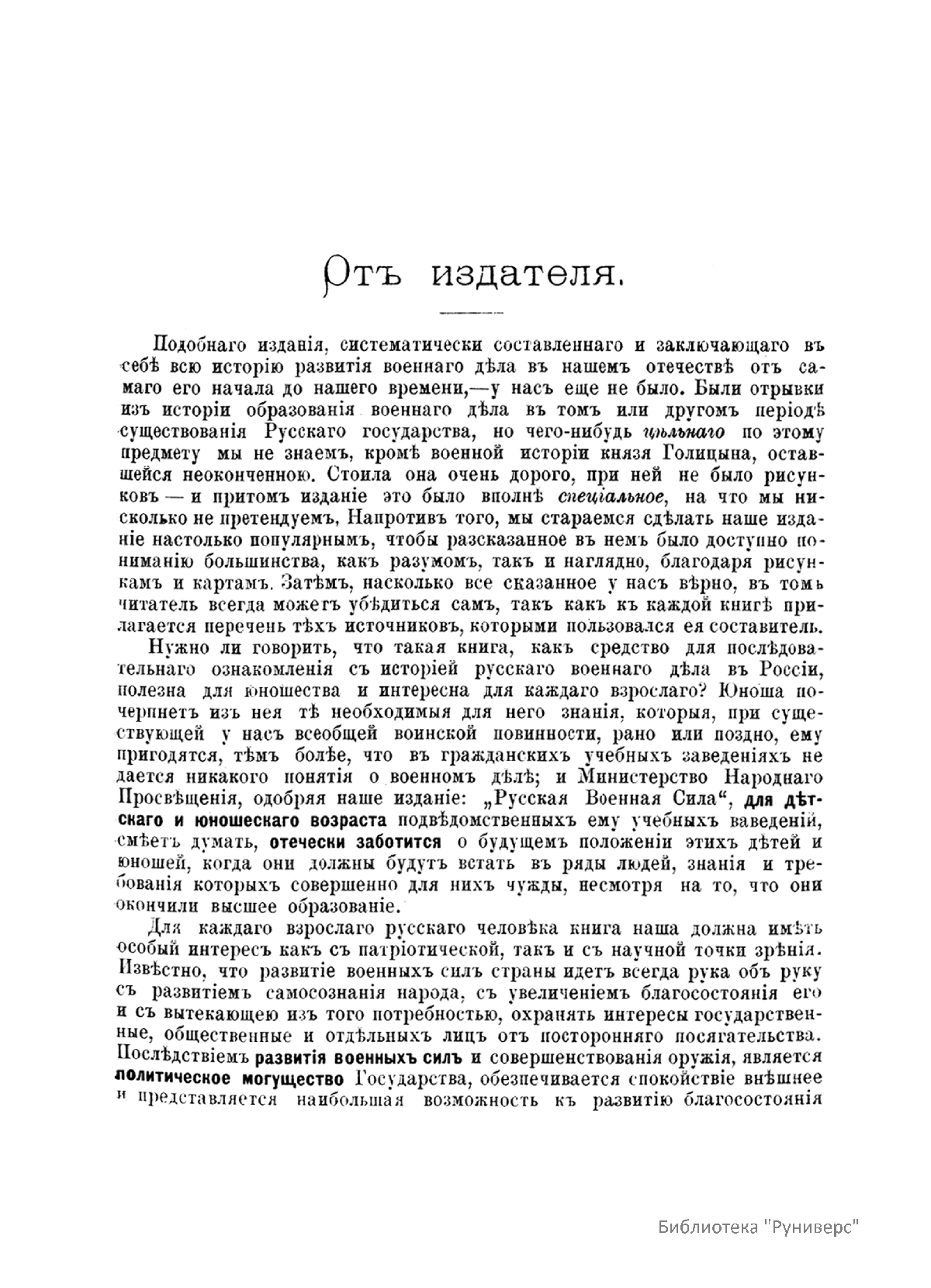 Данные очерки повествуют об истории военной силы на Руси от зарождения войска у древних славян до появления массовой армии эпохи Александра II и основных событий русско-турецкой войны 1877-1878 гг. Первые пять выпусков были посвящены периоду с древнейших времен до начала петровской эпохи в XVIII в. С 6-го по 11 выпуски сочинения описывают все важнейшие события ратной истории Российской империи XVIII и XIX веков, среди которых - Северная (1700-1721) и Семилетняя (1756-1763) войны, русско-турецкие войны 1769-1774 и 1787-1791 гг., участие России во 2-й антифранцузской коалиции 1799-1802 гг., Отечественная война 1812 года, Восточная (Крымская) война (1853-1856), наконец последняя русско-турецкая война (1877-1878 гг.). По своему характеру это издание представляет общедоступные очерки, написанные профессиональными военными историками на основе ранее изданных общеисторических и военно-исторических работ. В сжатой форме в них даны, в основном довольно ясно и правильно, общие сведения по развитию вооруженных сил Российского государства, а отдельные главы посвящены важнейшим этапам вооруженной борьбы России. Занимательный текст издания способствовал быстрому её распространению. Уже в 1892 г. было предпринято второе издание этих популярных очерков в 2-х томах. Более того, данное издание хорошо иллюстрировано. Оно содержит рисунки одежды и вооружения воинов разных эпох, карты, схемы сражений и укреплений важнейших битв и сражений в отечественной военной истории. В истории строительства вооруженных сил России было много необычного, оригинального в их комплектовании, организации, развитии способов военных действий, быте, взаимоотношениях военнослужащих и т.п., что особенно интересно будет узнать из этой книги широкому кругу читателей.