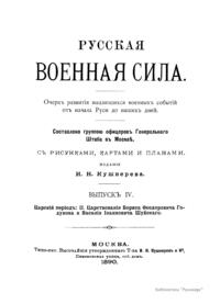 «Русская военная сила» (Очерк развития выдающихся военных событий от начала Руси до наших дней), составленная обществом офицеров Генерального штаба в Москве, начала публиковаться с 1888 г. «Русская военная сила» по праву считалась одним из лучших сводных общедоступных исследований по российской военной истории.