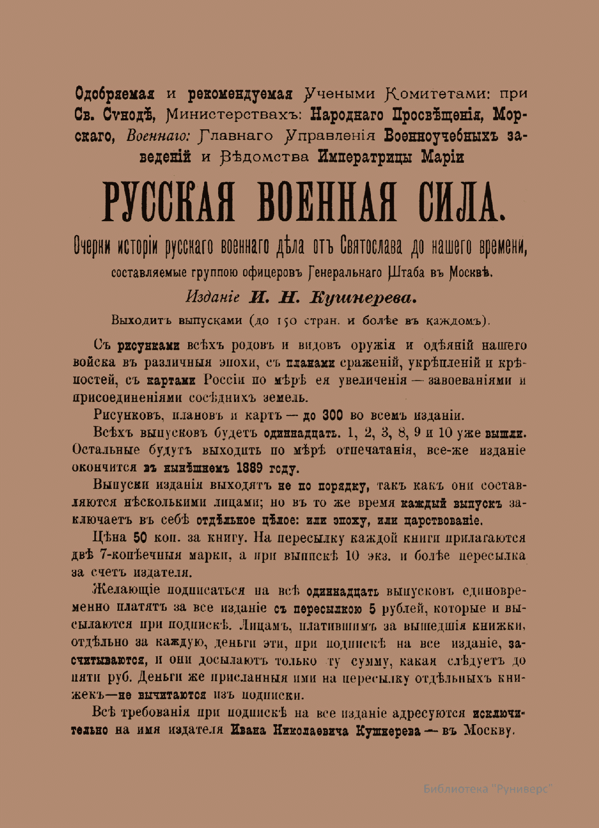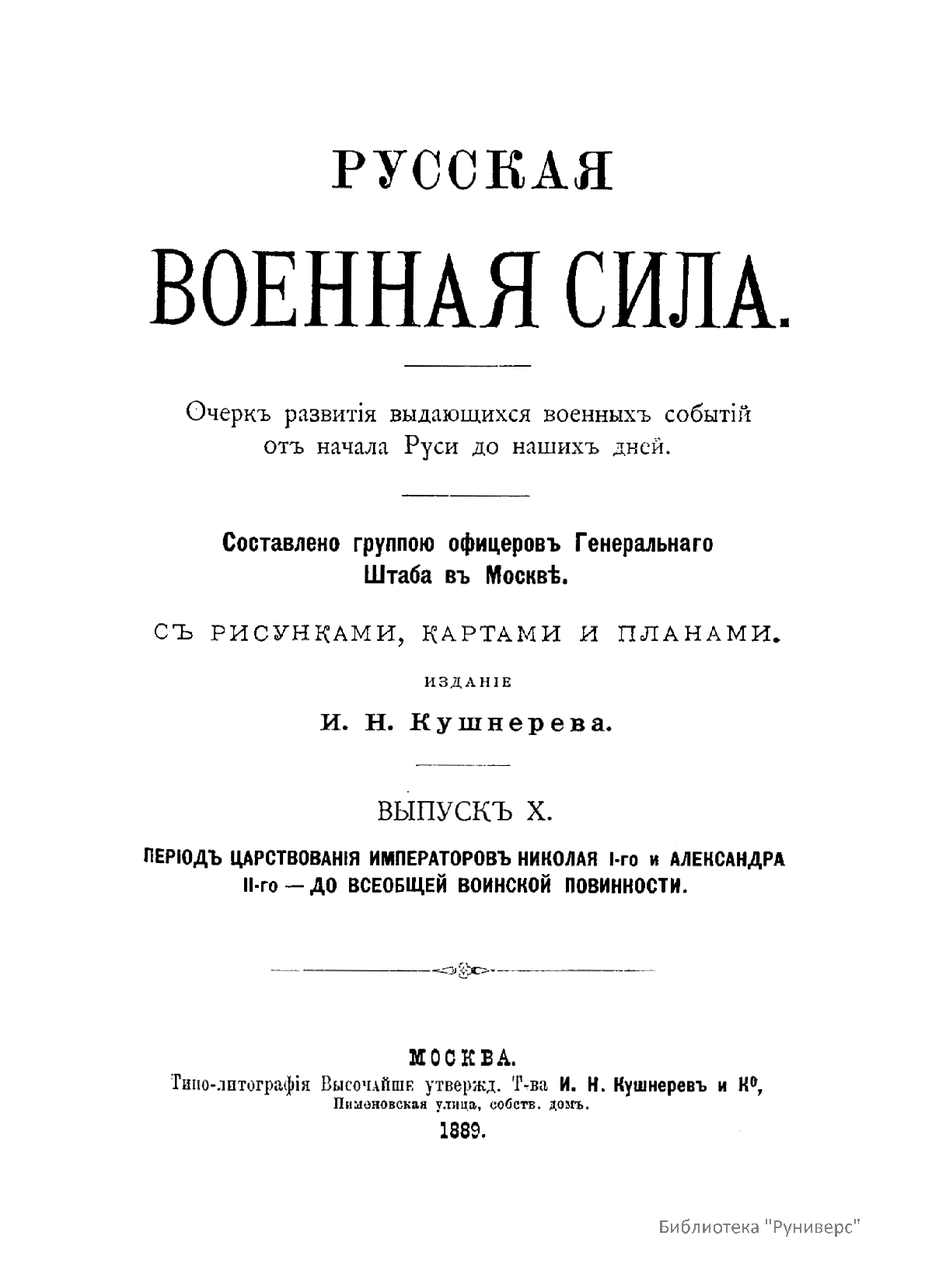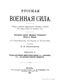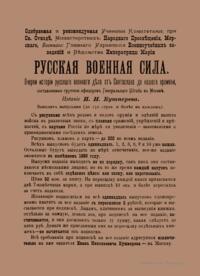 «Русская военная сила» (Очерк развития выдающихся военных событий от начала Руси до наших дней), составленная обществом офицеров Генерального штаба в Москве, начала публиковаться с 1888 г. «Русская военная сила» по праву считалась одним из лучших сводных общедоступных исследований по российской военной истории.