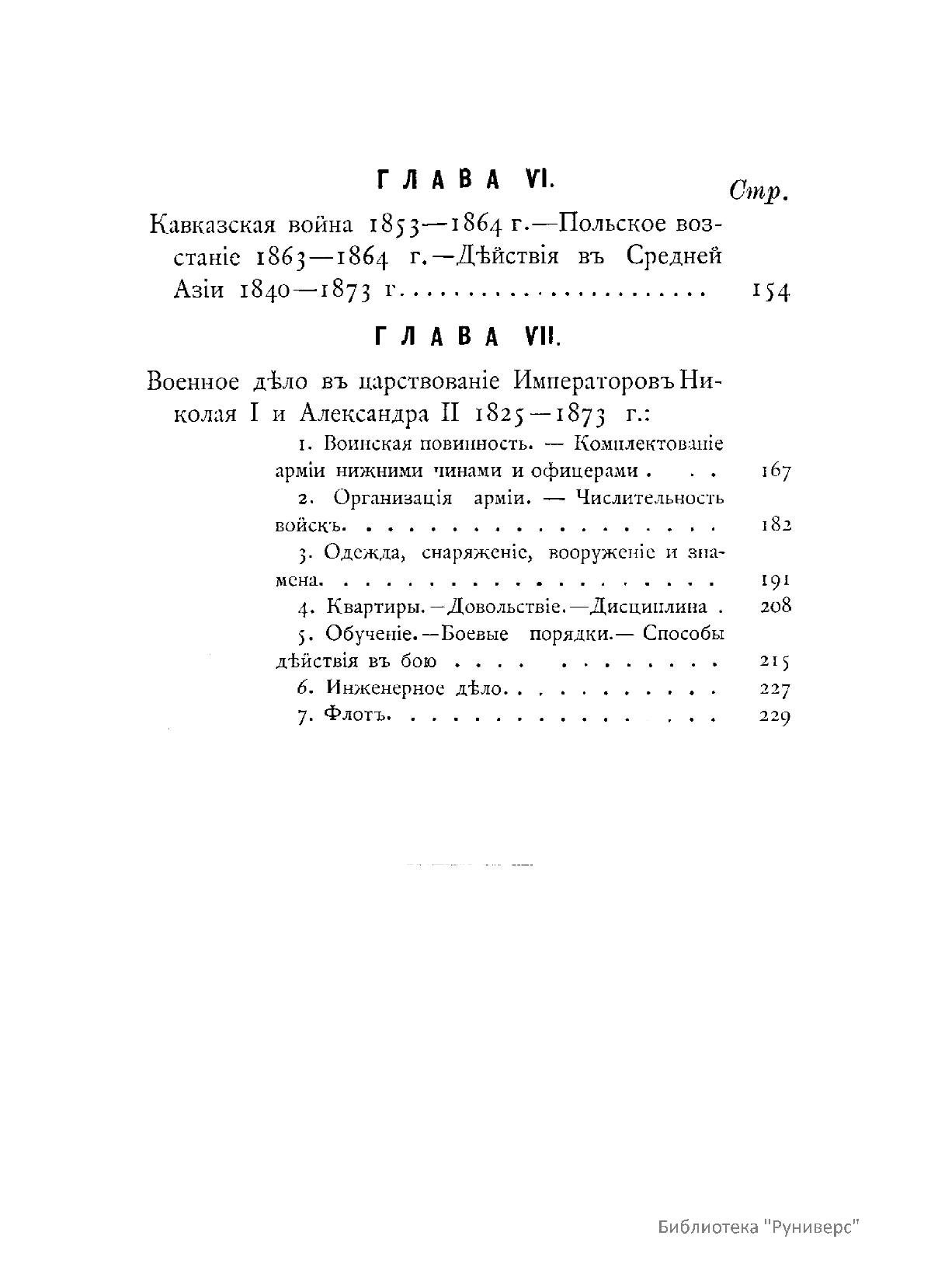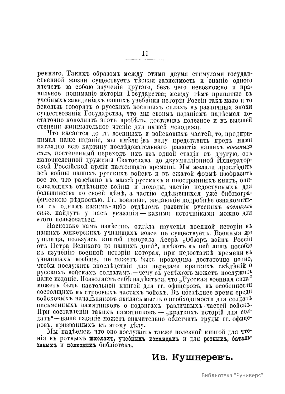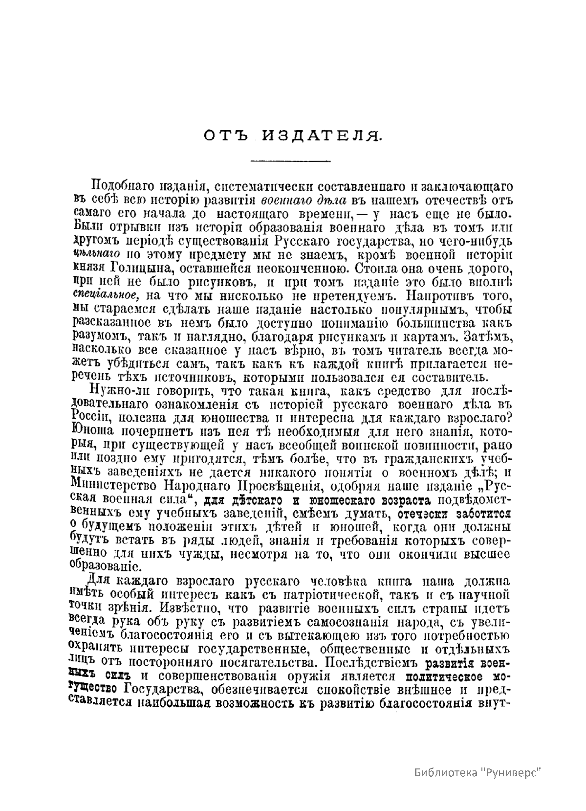 Данные очерки повествуют об истории военной силы на Руси от зарождения войска у древних славян до появления массовой армии эпохи Александра II и основных событий русско-турецкой войны 1877-1878 гг. Первые пять выпусков были посвящены периоду с древнейших времен до начала петровской эпохи в XVIII в. С 6-го по 11 выпуски сочинения описывают все важнейшие события ратной истории Российской империи XVIII и XIX веков, среди которых - Северная (1700-1721) и Семилетняя (1756-1763) войны, русско-турецкие войны 1769-1774 и 1787-1791 гг., участие России во 2-й антифранцузской коалиции 1799-1802 гг., Отечественная война 1812 года, Восточная (Крымская) война (1853-1856), наконец последняя русско-турецкая война (1877-1878 гг.). По своему характеру это издание представляет общедоступные очерки, написанные профессиональными военными историками на основе ранее изданных общеисторических и военно-исторических работ. В сжатой форме в них даны, в основном довольно ясно и правильно, общие сведения по развитию вооруженных сил Российского государства, а отдельные главы посвящены важнейшим этапам вооруженной борьбы России. Занимательный текст издания способствовал быстрому её распространению. Уже в 1892 г. было предпринято второе издание этих популярных очерков в 2-х томах. Более того, данное издание хорошо иллюстрировано. Оно содержит рисунки одежды и вооружения воинов разных эпох, карты, схемы сражений и укреплений важнейших битв и сражений в отечественной военной истории. В истории строительства вооруженных сил России было много необычного, оригинального в их комплектовании, организации, развитии способов военных действий, быте, взаимоотношениях военнослужащих и т.п., что особенно интересно будет узнать из этой книги широкому кругу читателей.