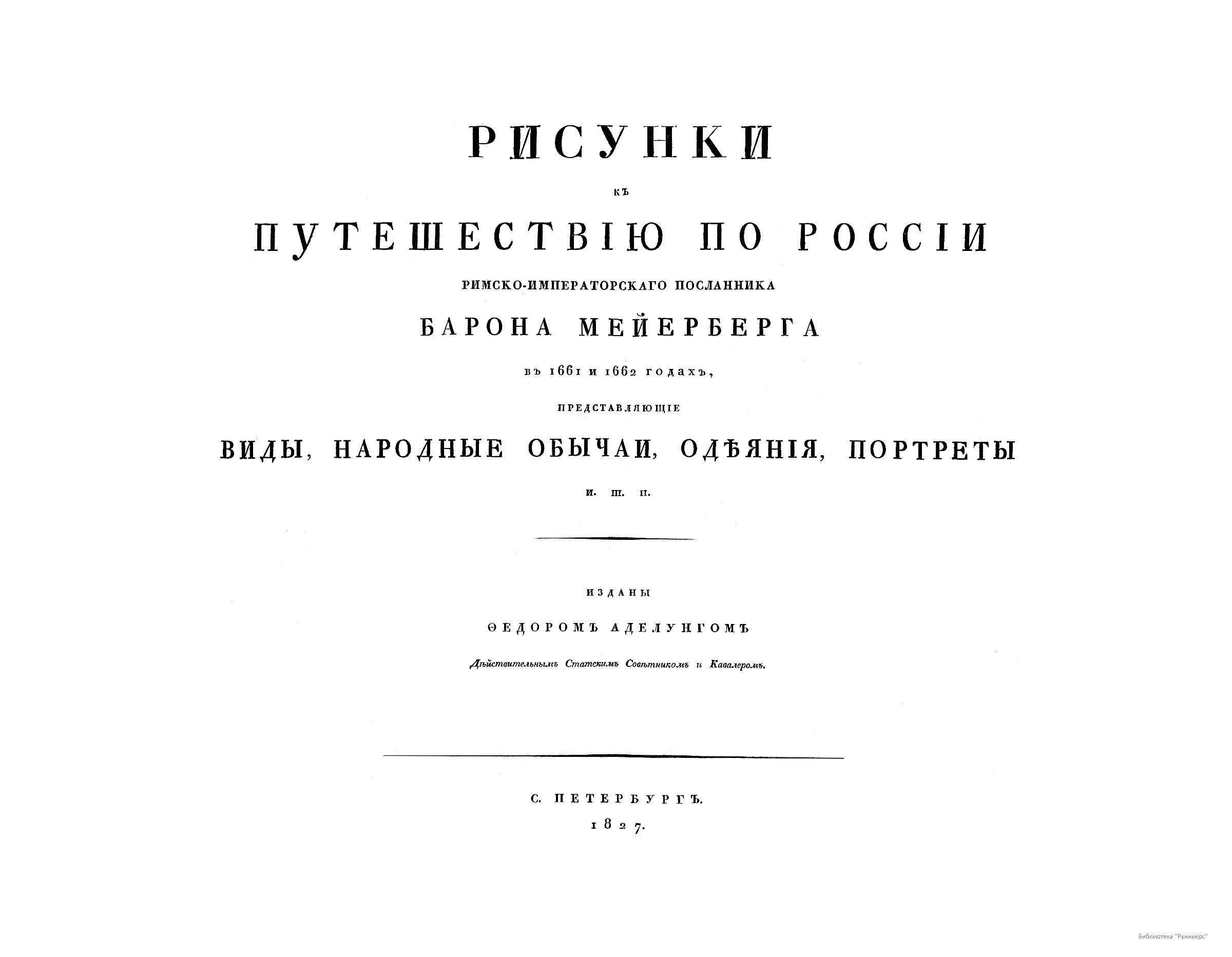 Рисунки, собранные бароном Мейербергом в 1661–1662 гг. во время его путешествия по России, хранились в Дрезденской библиотеке. Действительный статский советник Фёдор Аделунг в 1827 г. решил издать эти рисунки в России. Сначала рисунки копировались художником в Дрездене, а затем с копий воспроизводились литографом в Петербурге. По неизвестным причинам Аделунг воспроизвёл не все рисунки альбома Мейерберга, а двойная перерисовка, необходимая для его издания, значительно видоизменила оригинал. В книге представлено 64 рисунка. В 1903 г. в Санкт-Петербурге вышло
