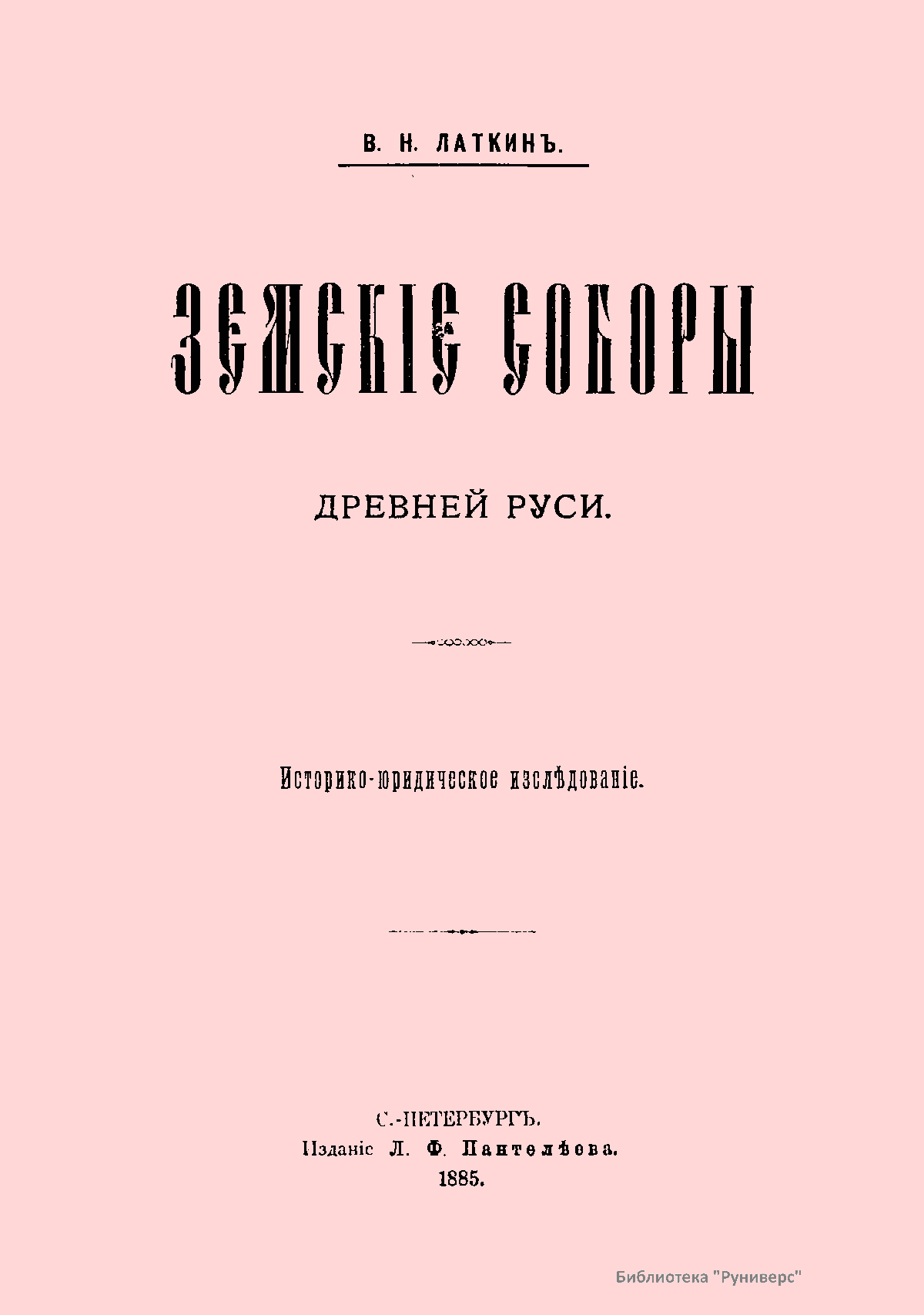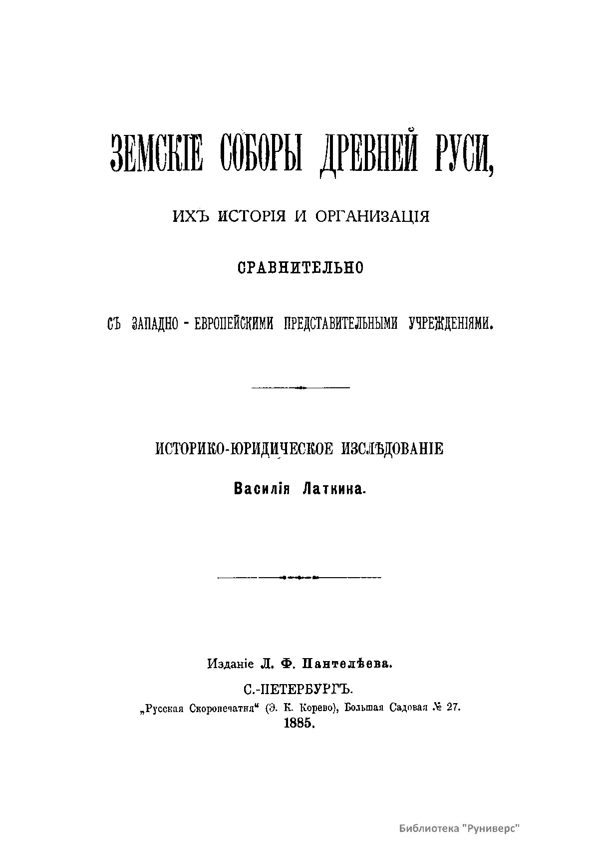 Земскiе соборы древней Руси, ихъ исторiя и организацiя сравнительно съ западно-европейскими представительными учрежденiями