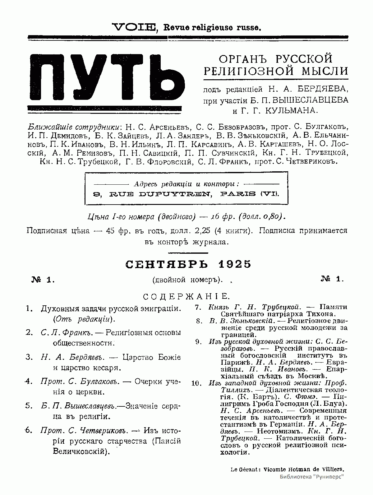 (1877- 1950) и др. В дальнейшем состав сотрудников менялся, привлекались также немецкие и английские корреспонденты (Ж. Маритен, П. Тиллих, С. Оллард и др.). Всего с журналом за 15 лет его существования сотрудничали около 130 человек. Журнал насчитывал 61 выпуск при тираже 1000–1200 экземпляров. По своему формату это было интеллектуальное богословско-философское периодическое издание, включающее наряду с академическими статьями, публицистику, эссе, письма, мемуары.