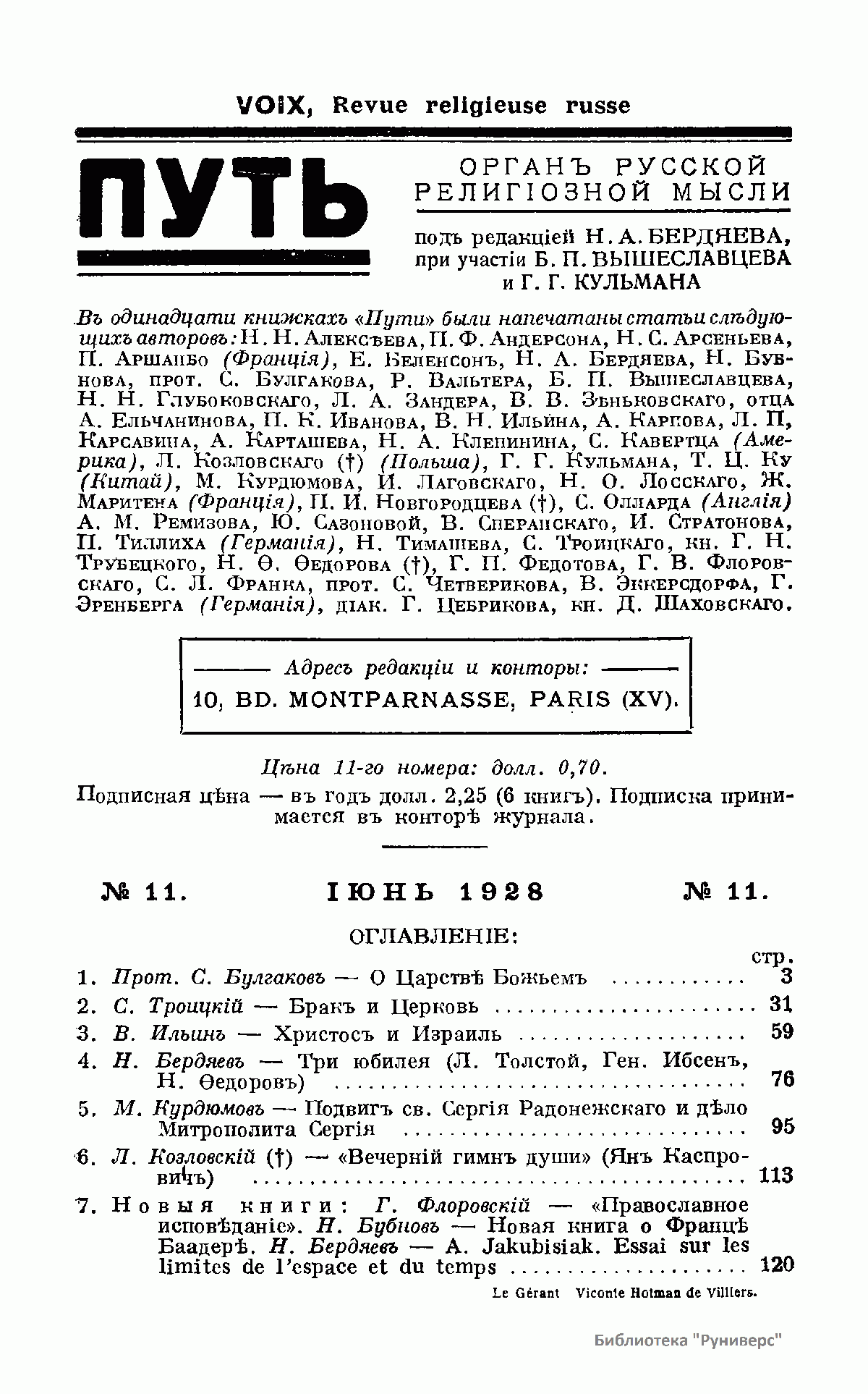 Путь: Орган русской религиозной мысли. №11. Июль 1928