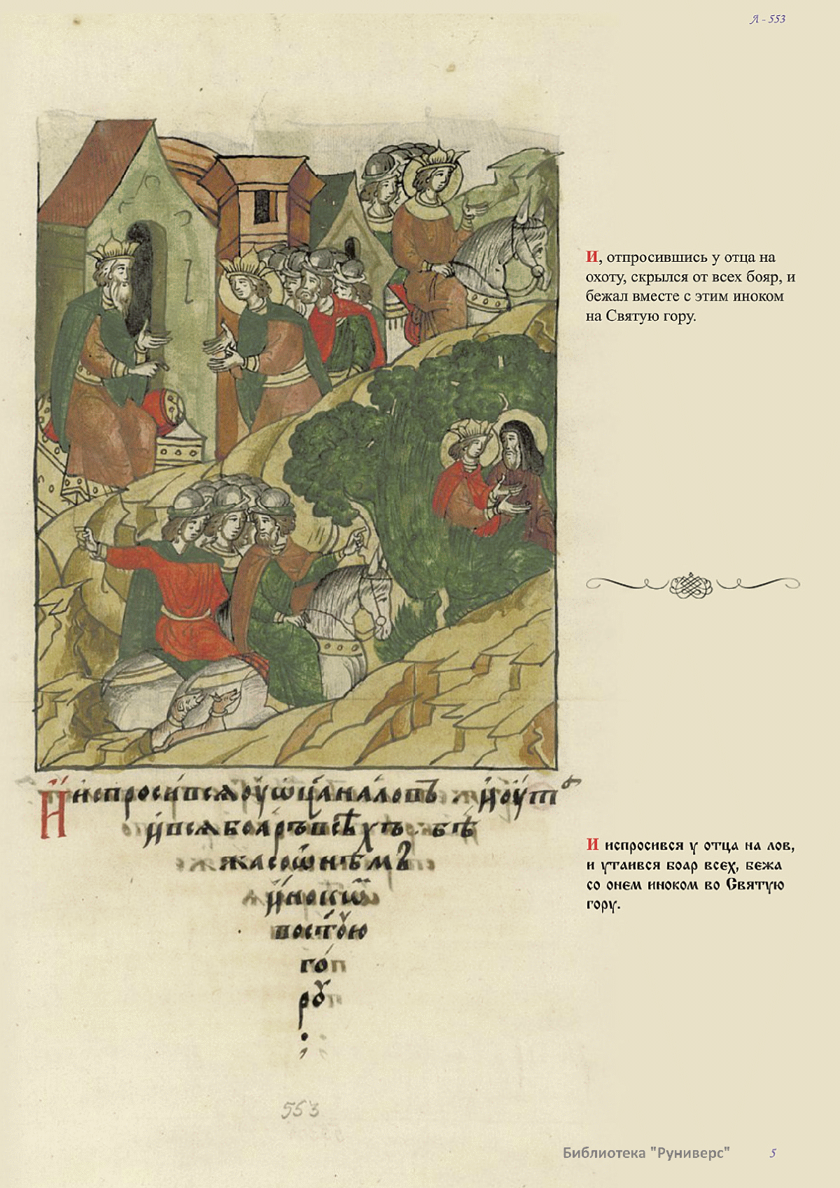 Лицевой летописный свод. XVI века — монументальный памятник древнерусского книжного искусства. На 10 тысячах листов с более чем 17 тысячами красочных миниатюр — «окон в историю» — представлена самая ранняя историческая и литературная энциклопедия. Лицевой свод дошел до наших дней в 10 томах, находящихся в разных древлехранилищах: БАН к РНБ в Санкт-Петербурге и ГИМ в Москве. Фирма «АКТЕОН» совместно с хранителями впервые осуществила научное факсимильное издание «Лицевой летописный свод XVI века». Предлагаемое издание с переводом — как дополнение в рамках научного аппарата вышеназванного факсимиле - представлено тремя разделами: библейская история, всемирная история, русская летописная история. В настоящем издании листы расположены в хронологическом порядке повествования На внешнем поле размещены транслитерация и перевод на современный русский язык. Русская летописная история 1114—1567 гг. — отражена на 6010 Лицевого летописного свода XVI века в следующих его томах: Г — Голицынский том (Отдел рукописей Российский национальной библиотеки, F.IV.225), Л — Лаптевский TOM (Отдел рукописей Российской национальной библиотеки, F.IV.233), O-I — Остермановский первый том (Отдел рукописей Библиотеки Академии наук, 31. 7. 30-1), O-II — Остермановский второй той (Отдел рукописей Библиотеки Академии наук, 31, 7. 30-2), Ш — Шумиловский том (Отдел рукописей Российской национальной библиотеки, F, IY. 232), С — Синодальный том (Отдел рукописей Государственного Исторического музея. Син. № 962), Ц— Царственная книга (Отдел рукописей Государственного Историческою музея. Син. № 149). В сносках отряжены разночтения с перепей ПСРЛ — Полным собранием русских летописей - фундаментальной для изучения истории древней и средневековой Руси книжной серией (её тексты, в основном, издавались наборно, в орфографии XIX века).