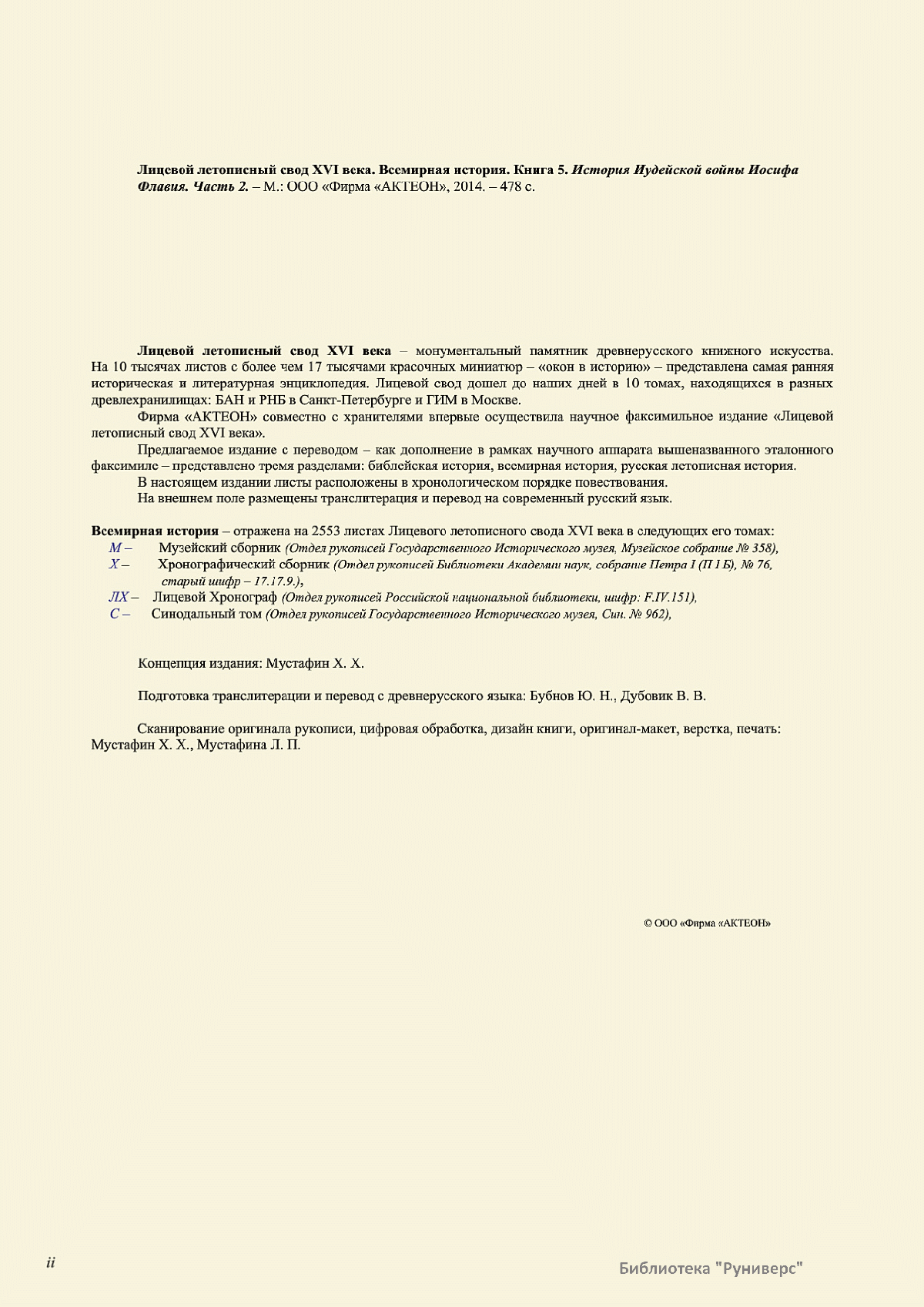 Лицевой летописный свод. XVI века — монументальный памятник древнерусского книжного искусства. На 10 тысячах листов с более чем 17 тысячами красочных миниатюр — «окон в историю» — представлена самая ранняя историческая и литературная энциклопедия. Лицевой свод дошел до наших дней в 10 томах, находящихся в разных древлехранилищах: БАН к РНБ в Санкт-Петербурге и ГИМ в Москве. Фирма «АКТЕОН» совместно с хранителями впервые осуществила научное факсимильное издание «Лицевой летописный свод XVI века». Предлагаемое издание с переводом — как дополнение в рамках научного аппарата вышеназванного факсимиле - представлено тремя разделами: библейская история, всемирная история, русская летописная история. В настоящем издании листы расположены в хронологическом порядке повествования На внешнем поле размещены транслитерация и перевод на современный русский язык. Русская летописная история 1114—1567 гг. — отражена на 6010 Лицевого летописного свода XVI века в следующих его томах: Г — Голицынский том (Отдел рукописей Российский национальной библиотеки, F.IV.225), Л — Лаптевский TOM (Отдел рукописей Российской национальной библиотеки, F.IV.233), O-I — Остермановский первый том (Отдел рукописей Библиотеки Академии наук, 31. 7. 30-1), O-II — Остермановский второй той (Отдел рукописей Библиотеки Академии наук, 31, 7. 30-2), Ш — Шумиловский том (Отдел рукописей Российской национальной библиотеки, F, IY. 232), С — Синодальный том (Отдел рукописей Государственного Исторического музея. Син. № 962), Ц— Царственная книга (Отдел рукописей Государственного Историческою музея. Син. № 149). В сносках отряжены разночтения с перепей ПСРЛ — Полным собранием русских летописей - фундаментальной для изучения истории древней и средневековой Руси книжной серией (её тексты, в основном, издавались наборно, в орфографии XIX века).
