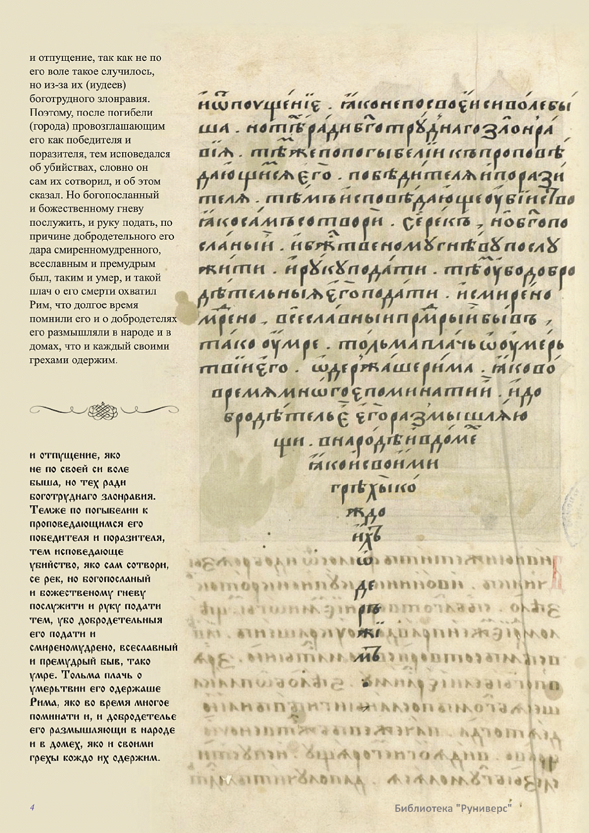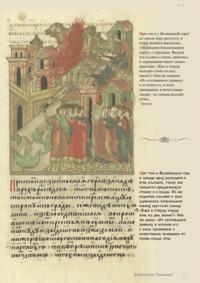 Лицевой летописный свод. XVI века — монументальный памятник древнерусского книжного искусства. На 10 тысячах листов с более чем 17 тысячами красочных миниатюр — «окон в историю» — представлена самая ранняя историческая и литературная энциклопедия. Лицевой свод дошел до наших дней в 10 томах, находящихся в разных древлехранилищах: БАН к РНБ в Санкт-Петербурге и ГИМ в Москве. Фирма «АКТЕОН» совместно с хранителями впервые осуществила научное факсимильное издание «Лицевой летописный свод XVI века». Предлагаемое издание с переводом — как дополнение в рамках научного аппарата вышеназванного факсимиле - представлено тремя разделами: библейская история, всемирная история, русская летописная история. В настоящем издании листы расположены в хронологическом порядке повествования На внешнем поле размещены транслитерация и перевод на современный русский язык. Русская летописная история 1114—1567 гг. — отражена на 6010 Лицевого летописного свода XVI века в следующих его томах: Г — Голицынский том (Отдел рукописей Российский национальной библиотеки, F.IV.225), Л — Лаптевский TOM (Отдел рукописей Российской национальной библиотеки, F.IV.233), O-I — Остермановский первый том (Отдел рукописей Библиотеки Академии наук, 31. 7. 30-1), O-II — Остермановский второй той (Отдел рукописей Библиотеки Академии наук, 31, 7. 30-2), Ш — Шумиловский том (Отдел рукописей Российской национальной библиотеки, F, IY. 232), С — Синодальный том (Отдел рукописей Государственного Исторического музея. Син. № 962), Ц— Царственная книга (Отдел рукописей Государственного Историческою музея. Син. № 149). В сносках отряжены разночтения с перепей ПСРЛ — Полным собранием русских летописей - фундаментальной для изучения истории древней и средневековой Руси книжной серией (её тексты, в основном, издавались наборно, в орфографии XIX века).