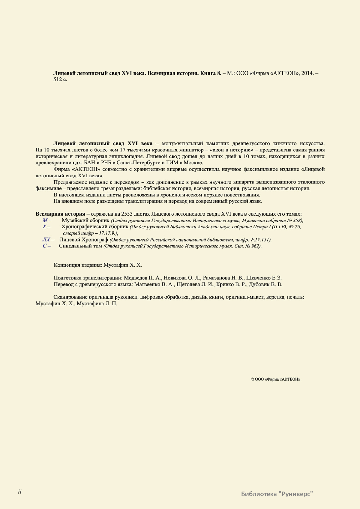 Лицевой летописный свод. XVI века — монументальный памятник древнерусского книжного искусства. На 10 тысячах листов с более чем 17 тысячами красочных миниатюр — «окон в историю» — представлена самая ранняя историческая и литературная энциклопедия. Лицевой свод дошел до наших дней в 10 томах, находящихся в разных древлехранилищах: БАН к РНБ в Санкт-Петербурге и ГИМ в Москве. Фирма «АКТЕОН» совместно с хранителями впервые осуществила научное факсимильное издание «Лицевой летописный свод XVI века». Предлагаемое издание с переводом — как дополнение в рамках научного аппарата вышеназванного факсимиле - представлено тремя разделами: библейская история, всемирная история, русская летописная история. В настоящем издании листы расположены в хронологическом порядке повествования На внешнем поле размещены транслитерация и перевод на современный русский язык. Русская летописная история 1114—1567 гг. — отражена на 6010 Лицевого летописного свода XVI века в следующих его томах: Г — Голицынский том (Отдел рукописей Российский национальной библиотеки, F.IV.225), Л — Лаптевский TOM (Отдел рукописей Российской национальной библиотеки, F.IV.233), O-I — Остермановский первый том (Отдел рукописей Библиотеки Академии наук, 31. 7. 30-1), O-II — Остермановский второй той (Отдел рукописей Библиотеки Академии наук, 31, 7. 30-2), Ш — Шумиловский том (Отдел рукописей Российской национальной библиотеки, F, IY. 232), С — Синодальный том (Отдел рукописей Государственного Исторического музея. Син. № 962), Ц— Царственная книга (Отдел рукописей Государственного Историческою музея. Син. № 149). В сносках отряжены разночтения с перепей ПСРЛ — Полным собранием русских летописей - фундаментальной для изучения истории древней и средневековой Руси книжной серией (её тексты, в основном, издавались наборно, в орфографии XIX века).