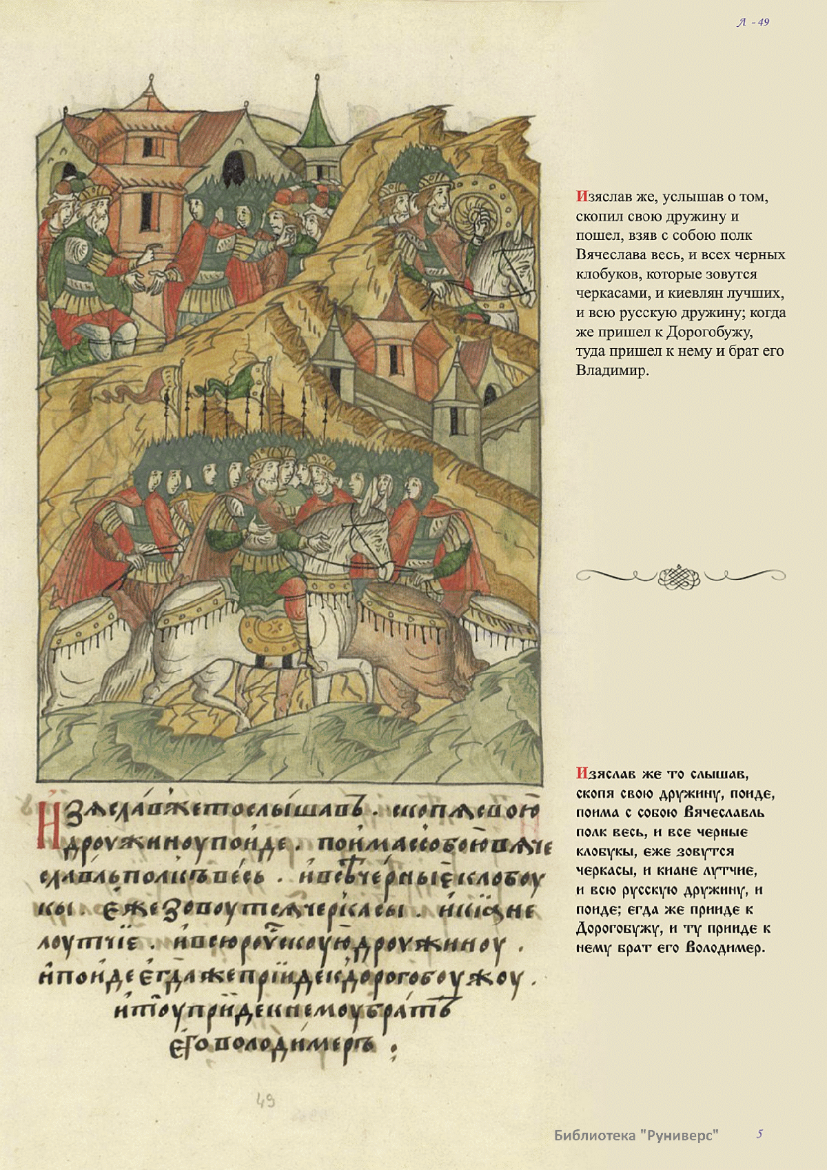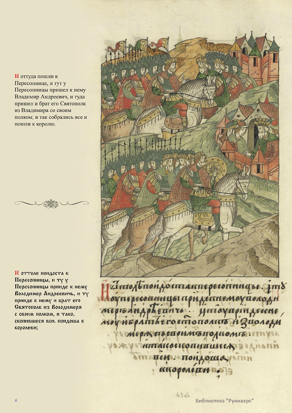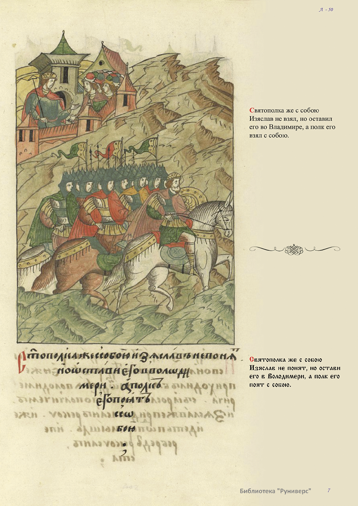 Лицевой летописный свод. XVI века — монументальный памятник древнерусского книжного искусства. На 10 тысячах листов с более чем 17 тысячами красочных миниатюр — «окон в историю» — представлена самая ранняя историческая и литературная энциклопедия. Лицевой свод дошел до наших дней в 10 томах, находящихся в разных древлехранилищах: БАН к РНБ в Санкт-Петербурге и ГИМ в Москве. Фирма «АКТЕОН» совместно с хранителями впервые осуществила научное факсимильное издание «Лицевой летописный свод XVI века». Предлагаемое издание с переводом — как дополнение в рамках научного аппарата вышеназванного факсимиле - представлено тремя разделами: библейская история, всемирная история, русская летописная история. В настоящем издании листы расположены в хронологическом порядке повествования На внешнем поле размещены транслитерация и перевод на современный русский язык. Русская летописная история 1114—1567 гг. — отражена на 6010 Лицевого летописного свода XVI века в следующих его томах: Г — Голицынский том (Отдел рукописей Российский национальной библиотеки, F.IV.225), Л — Лаптевский TOM (Отдел рукописей Российской национальной библиотеки, F.IV.233), O-I — Остермановский первый том (Отдел рукописей Библиотеки Академии наук, 31. 7. 30-1), O-II — Остермановский второй той (Отдел рукописей Библиотеки Академии наук, 31, 7. 30-2), Ш — Шумиловский том (Отдел рукописей Российской национальной библиотеки, F, IY. 232), С — Синодальный том (Отдел рукописей Государственного Исторического музея. Син. № 962), Ц— Царственная книга (Отдел рукописей Государственного Историческою музея. Син. № 149). В сносках отряжены разночтения с перепей ПСРЛ — Полным собранием русских летописей - фундаментальной для изучения истории древней и средневековой Руси книжной серией (её тексты, в основном, издавались наборно, в орфографии XIX века).