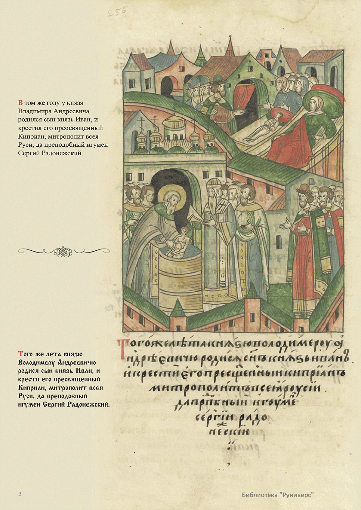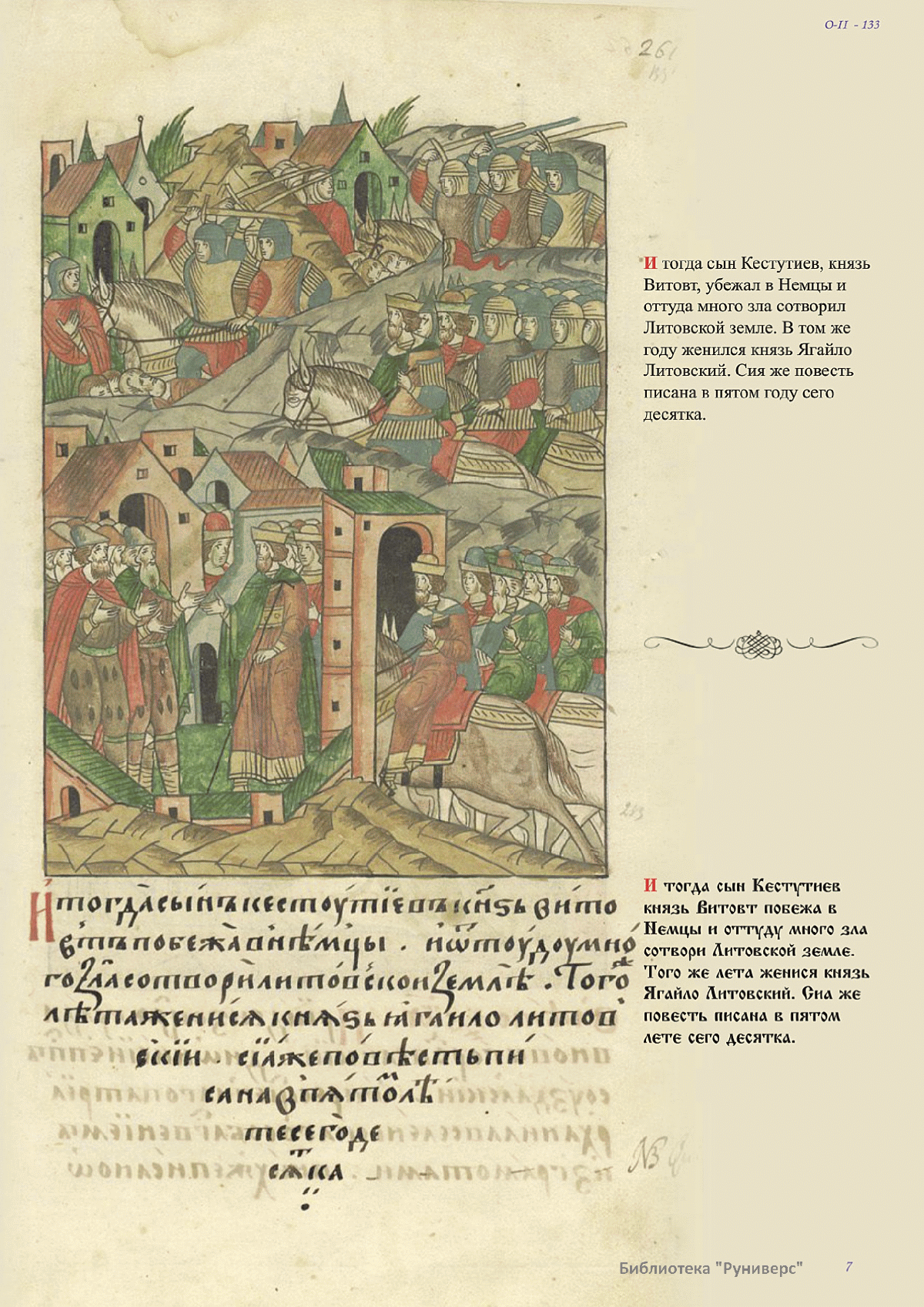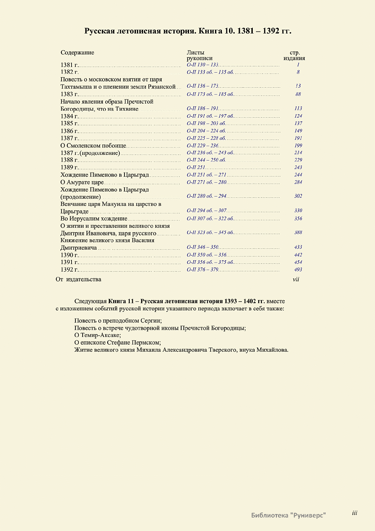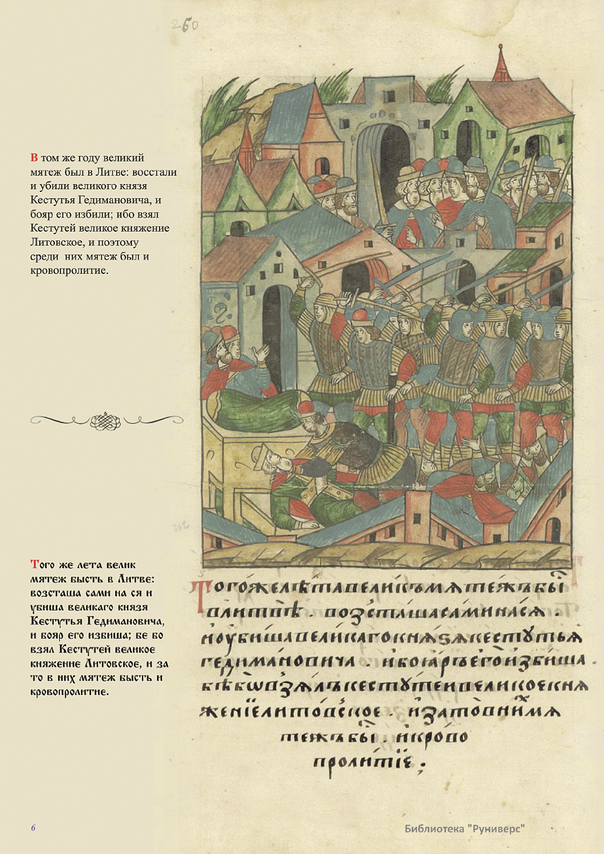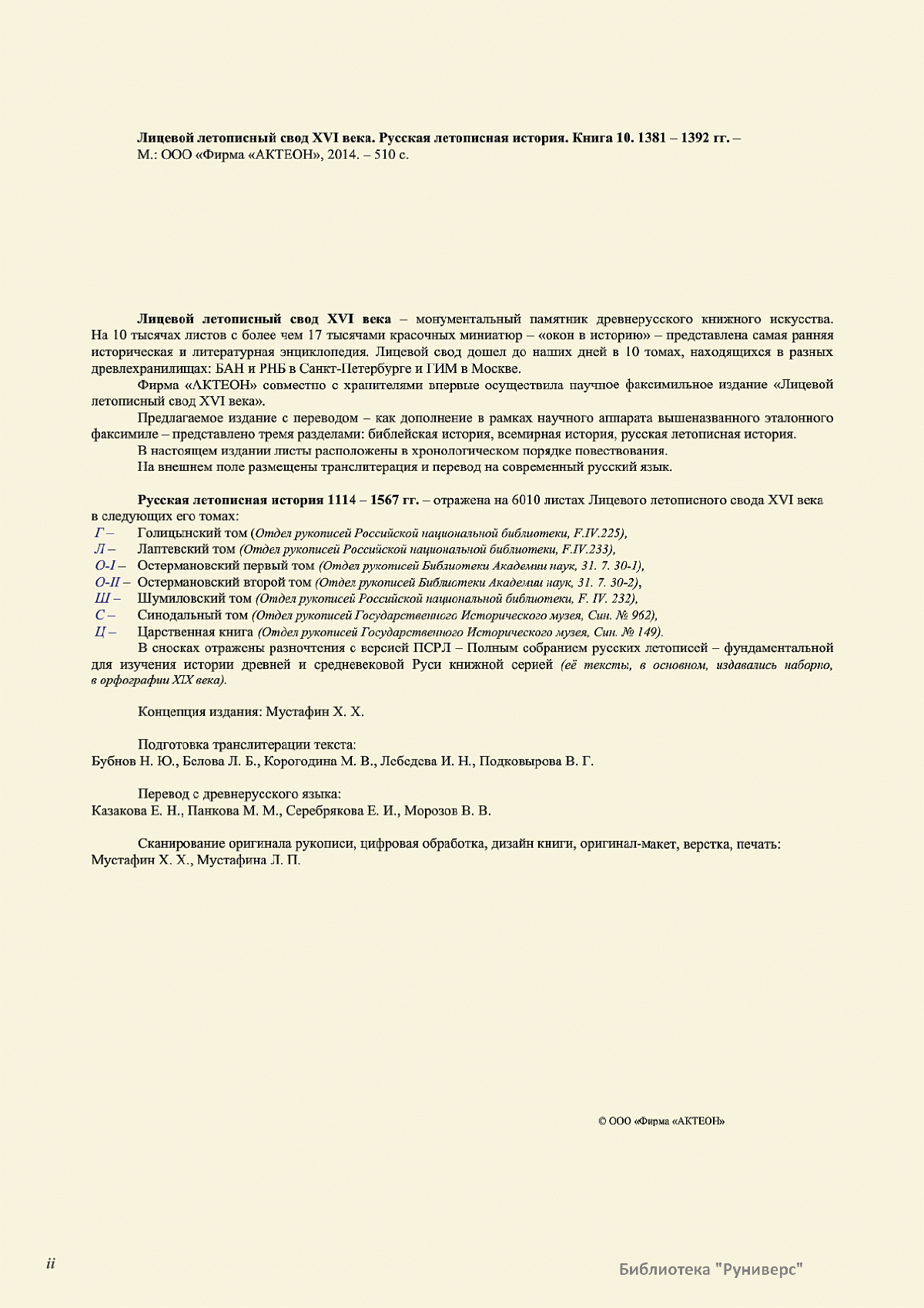 Лицевой летописный свод. XVI века — монументальный памятник древнерусского книжного искусства. На 10 тысячах листов с более чем 17 тысячами красочных миниатюр — «окон в историю» — представлена самая ранняя историческая и литературная энциклопедия. Лицевой свод дошел до наших дней в 10 томах, находящихся в разных древлехранилищах: БАН к РНБ в Санкт-Петербурге и ГИМ в Москве. Фирма «АКТЕОН» совместно с хранителями впервые осуществила научное факсимильное издание «Лицевой летописный свод XVI века». Предлагаемое издание с переводом — как дополнение в рамках научного аппарата вышеназванного факсимиле - представлено тремя разделами: библейская история, всемирная история, русская летописная история. В настоящем издании листы расположены в хронологическом порядке повествования На внешнем поле размещены транслитерация и перевод на современный русский язык. Русская летописная история 1114—1567 гг. — отражена на 6010 Лицевого летописного свода XVI века в следующих его томах: Г — Голицынский том (Отдел рукописей Российский национальной библиотеки, F.IV.225), Л — Лаптевский TOM (Отдел рукописей Российской национальной библиотеки, F.IV.233), O-I — Остермановский первый том (Отдел рукописей Библиотеки Академии наук, 31. 7. 30-1), O-II — Остермановский второй той (Отдел рукописей Библиотеки Академии наук, 31, 7. 30-2), Ш — Шумиловский том (Отдел рукописей Российской национальной библиотеки, F, IY. 232), С — Синодальный том (Отдел рукописей Государственного Исторического музея. Син. № 962), Ц— Царственная книга (Отдел рукописей Государственного Историческою музея. Син. № 149). В сносках отряжены разночтения с перепей ПСРЛ — Полным собранием русских летописей - фундаментальной для изучения истории древней и средневековой Руси книжной серией (её тексты, в основном, издавались наборно, в орфографии XIX века).