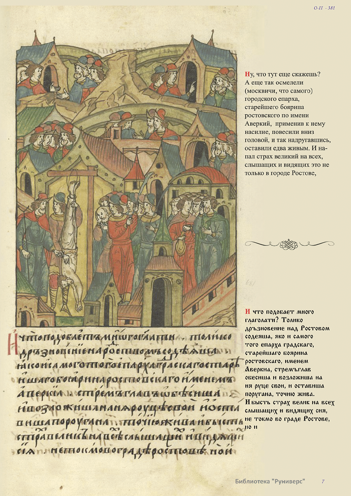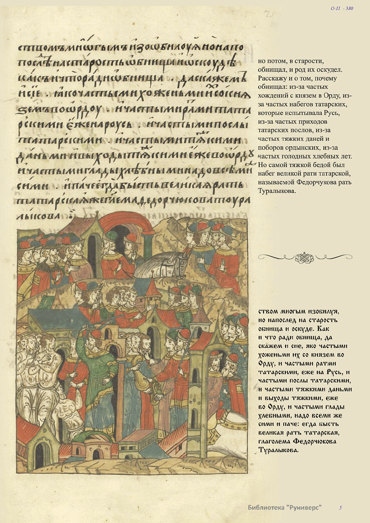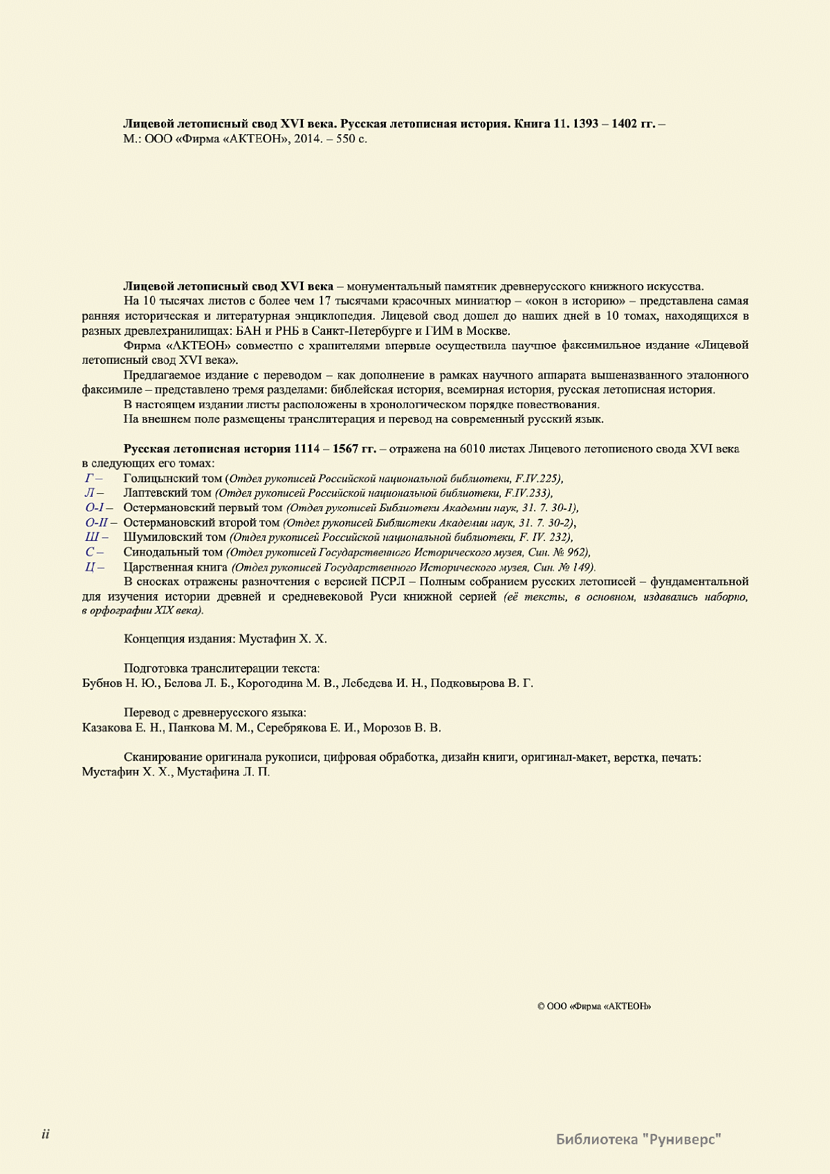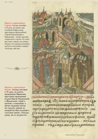 Лицевой летописный свод. XVI века — монументальный памятник древнерусского книжного искусства. На 10 тысячах листов с более чем 17 тысячами красочных миниатюр — «окон в историю» — представлена самая ранняя историческая и литературная энциклопедия. Лицевой свод дошел до наших дней в 10 томах, находящихся в разных древлехранилищах: БАН к РНБ в Санкт-Петербурге и ГИМ в Москве. Фирма «АКТЕОН» совместно с хранителями впервые осуществила научное факсимильное издание «Лицевой летописный свод XVI века». Предлагаемое издание с переводом — как дополнение в рамках научного аппарата вышеназванного факсимиле - представлено тремя разделами: библейская история, всемирная история, русская летописная история. В настоящем издании листы расположены в хронологическом порядке повествования На внешнем поле размещены транслитерация и перевод на современный русский язык. Русская летописная история 1114—1567 гг. — отражена на 6010 Лицевого летописного свода XVI века в следующих его томах: Г — Голицынский том (Отдел рукописей Российский национальной библиотеки, F.IV.225), Л — Лаптевский TOM (Отдел рукописей Российской национальной библиотеки, F.IV.233), O-I — Остермановский первый том (Отдел рукописей Библиотеки Академии наук, 31. 7. 30-1), O-II — Остермановский второй той (Отдел рукописей Библиотеки Академии наук, 31, 7. 30-2), Ш — Шумиловский том (Отдел рукописей Российской национальной библиотеки, F, IY. 232), С — Синодальный том (Отдел рукописей Государственного Исторического музея. Син. № 962), Ц— Царственная книга (Отдел рукописей Государственного Историческою музея. Син. № 149). В сносках отряжены разночтения с перепей ПСРЛ — Полным собранием русских летописей - фундаментальной для изучения истории древней и средневековой Руси книжной серией (её тексты, в основном, издавались наборно, в орфографии XIX века).