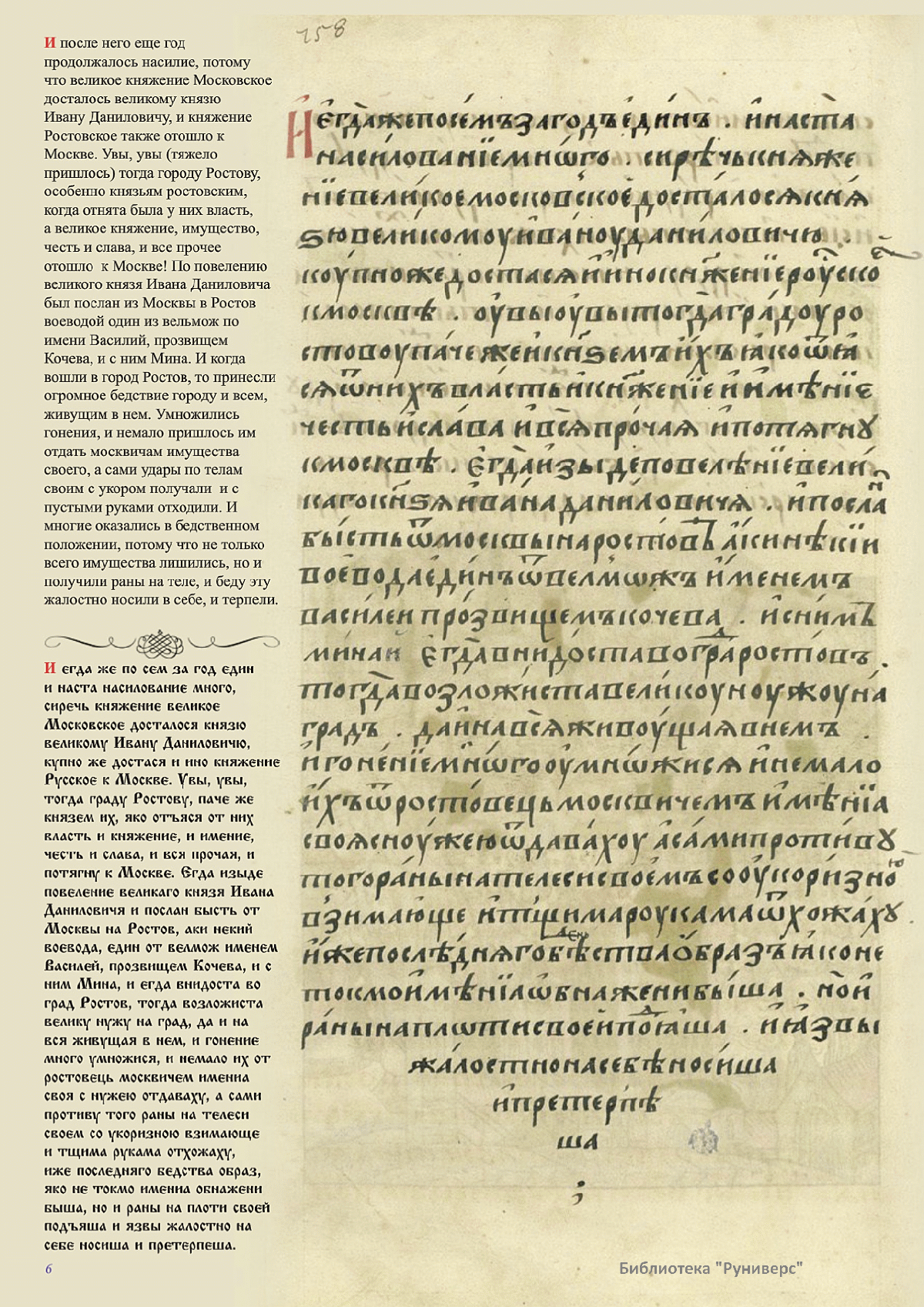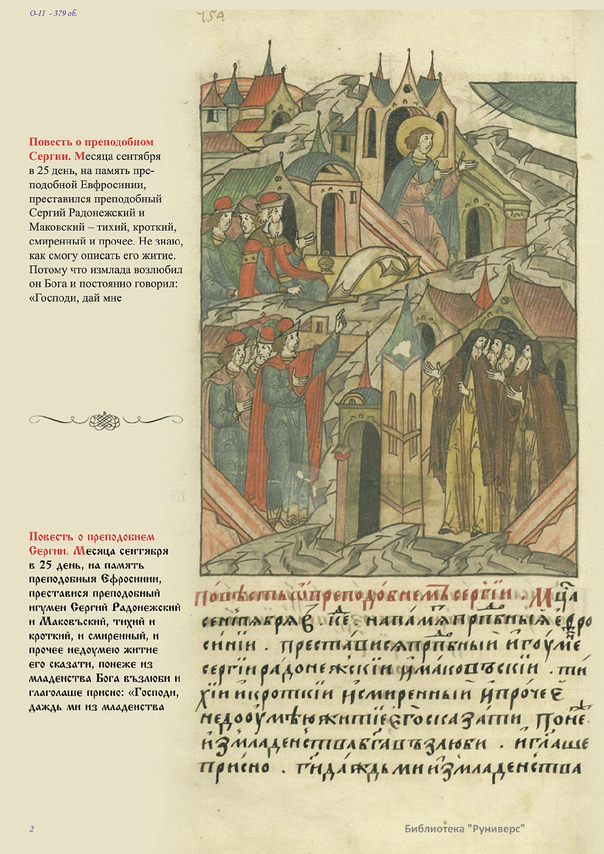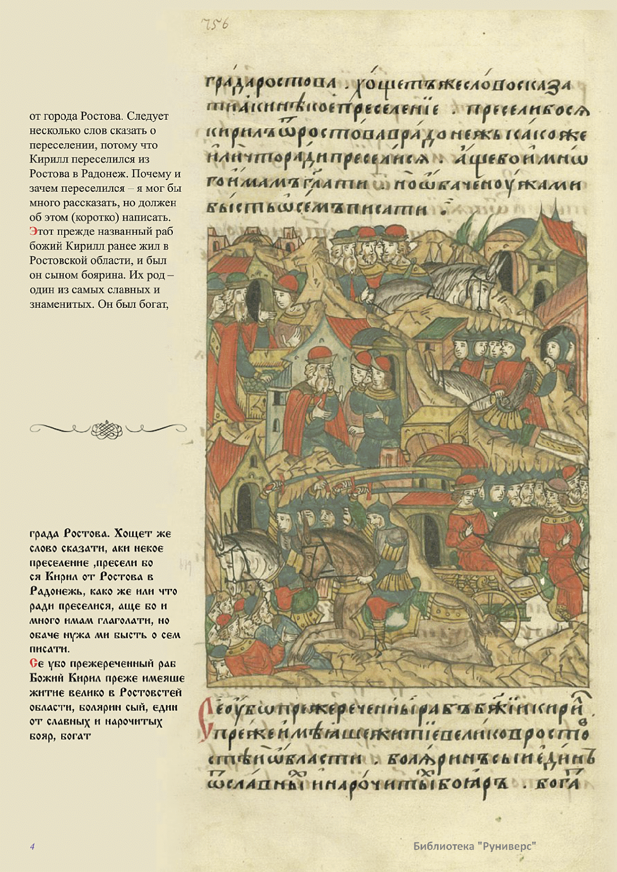 Лицевой летописный свод. XVI века — монументальный памятник древнерусского книжного искусства. На 10 тысячах листов с более чем 17 тысячами красочных миниатюр — «окон в историю» — представлена самая ранняя историческая и литературная энциклопедия. Лицевой свод дошел до наших дней в 10 томах, находящихся в разных древлехранилищах: БАН к РНБ в Санкт-Петербурге и ГИМ в Москве. Фирма «АКТЕОН» совместно с хранителями впервые осуществила научное факсимильное издание «Лицевой летописный свод XVI века». Предлагаемое издание с переводом — как дополнение в рамках научного аппарата вышеназванного факсимиле - представлено тремя разделами: библейская история, всемирная история, русская летописная история. В настоящем издании листы расположены в хронологическом порядке повествования На внешнем поле размещены транслитерация и перевод на современный русский язык. Русская летописная история 1114—1567 гг. — отражена на 6010 Лицевого летописного свода XVI века в следующих его томах: Г — Голицынский том (Отдел рукописей Российский национальной библиотеки, F.IV.225), Л — Лаптевский TOM (Отдел рукописей Российской национальной библиотеки, F.IV.233), O-I — Остермановский первый том (Отдел рукописей Библиотеки Академии наук, 31. 7. 30-1), O-II — Остермановский второй той (Отдел рукописей Библиотеки Академии наук, 31, 7. 30-2), Ш — Шумиловский том (Отдел рукописей Российской национальной библиотеки, F, IY. 232), С — Синодальный том (Отдел рукописей Государственного Исторического музея. Син. № 962), Ц— Царственная книга (Отдел рукописей Государственного Историческою музея. Син. № 149). В сносках отряжены разночтения с перепей ПСРЛ — Полным собранием русских летописей - фундаментальной для изучения истории древней и средневековой Руси книжной серией (её тексты, в основном, издавались наборно, в орфографии XIX века).
