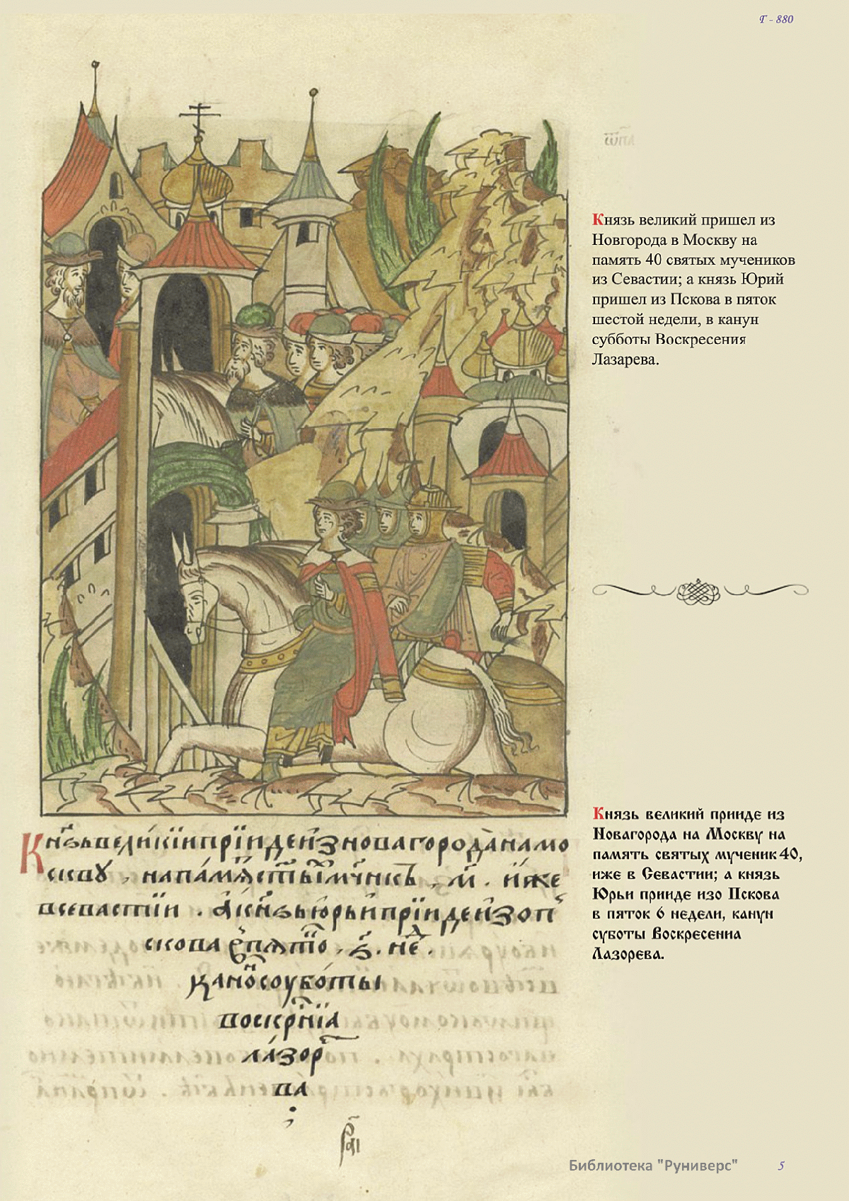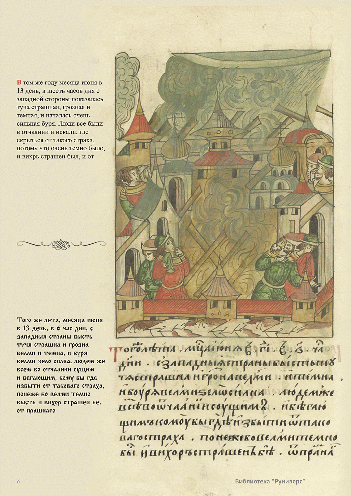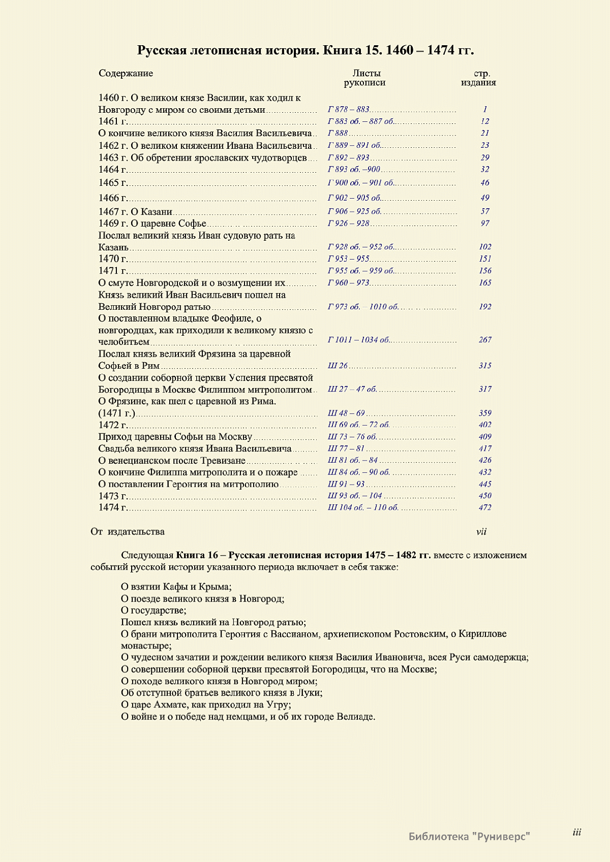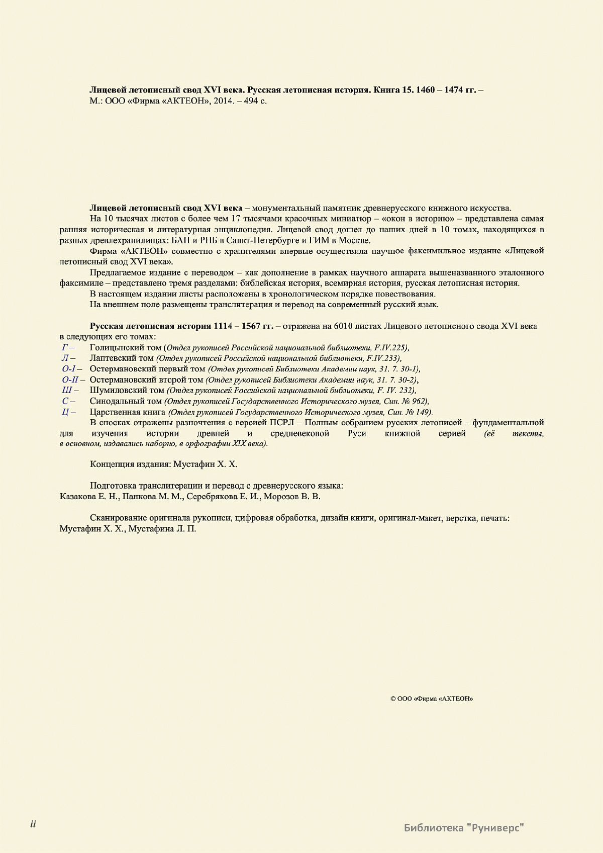 Лицевой летописный свод. XVI века — монументальный памятник древнерусского книжного искусства. На 10 тысячах листов с более чем 17 тысячами красочных миниатюр — «окон в историю» — представлена самая ранняя историческая и литературная энциклопедия. Лицевой свод дошел до наших дней в 10 томах, находящихся в разных древлехранилищах: БАН к РНБ в Санкт-Петербурге и ГИМ в Москве. Фирма «АКТЕОН» совместно с хранителями впервые осуществила научное факсимильное издание «Лицевой летописный свод XVI века». Предлагаемое издание с переводом — как дополнение в рамках научного аппарата вышеназванного факсимиле - представлено тремя разделами: библейская история, всемирная история, русская летописная история. В настоящем издании листы расположены в хронологическом порядке повествования На внешнем поле размещены транслитерация и перевод на современный русский язык. Русская летописная история 1114—1567 гг. — отражена на 6010 Лицевого летописного свода XVI века в следующих его томах: Г — Голицынский том (Отдел рукописей Российский национальной библиотеки, F.IV.225), Л — Лаптевский TOM (Отдел рукописей Российской национальной библиотеки, F.IV.233), O-I — Остермановский первый том (Отдел рукописей Библиотеки Академии наук, 31. 7. 30-1), O-II — Остермановский второй той (Отдел рукописей Библиотеки Академии наук, 31, 7. 30-2), Ш — Шумиловский том (Отдел рукописей Российской национальной библиотеки, F, IY. 232), С — Синодальный том (Отдел рукописей Государственного Исторического музея. Син. № 962), Ц— Царственная книга (Отдел рукописей Государственного Историческою музея. Син. № 149). В сносках отряжены разночтения с перепей ПСРЛ — Полным собранием русских летописей - фундаментальной для изучения истории древней и средневековой Руси книжной серией (её тексты, в основном, издавались наборно, в орфографии XIX века).