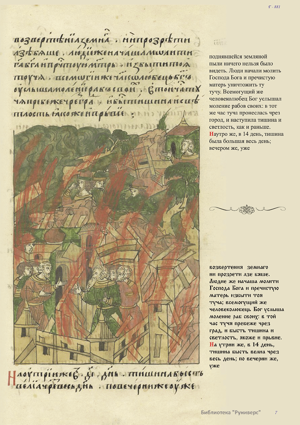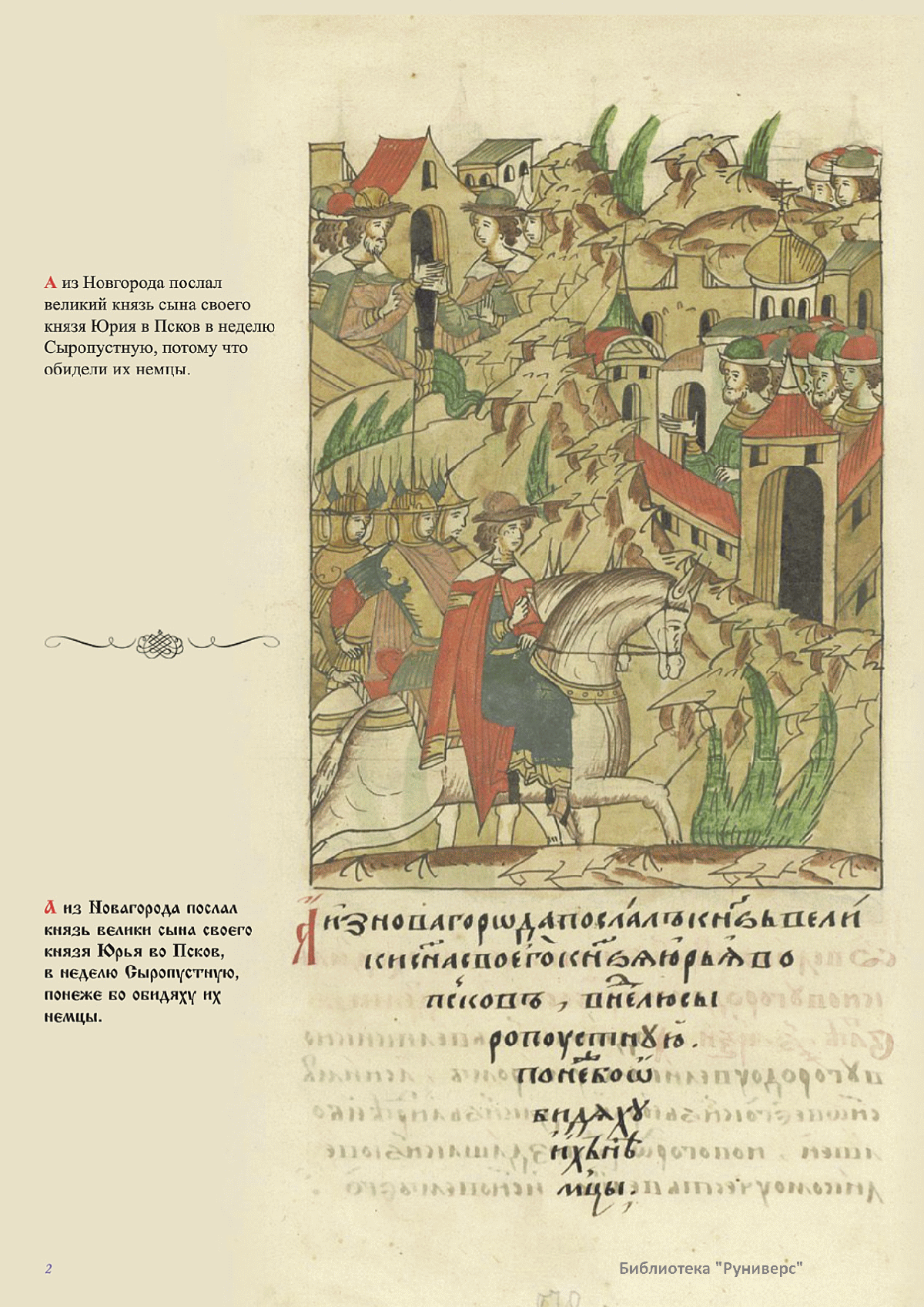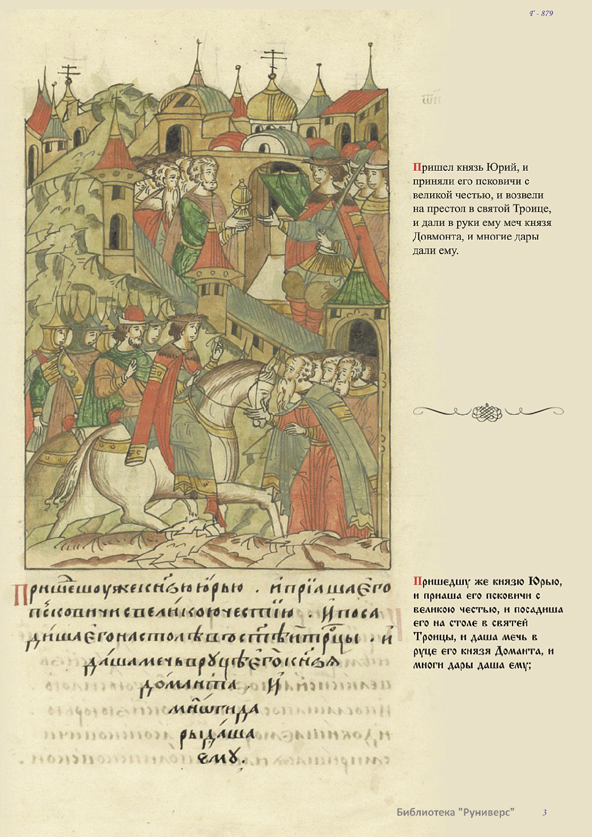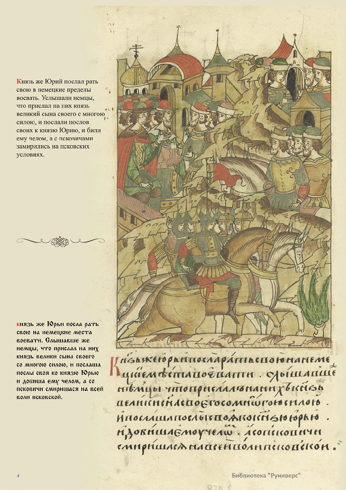 Лицевой летописный свод. XVI века — монументальный памятник древнерусского книжного искусства. На 10 тысячах листов с более чем 17 тысячами красочных миниатюр — «окон в историю» — представлена самая ранняя историческая и литературная энциклопедия. Лицевой свод дошел до наших дней в 10 томах, находящихся в разных древлехранилищах: БАН к РНБ в Санкт-Петербурге и ГИМ в Москве. Фирма «АКТЕОН» совместно с хранителями впервые осуществила научное факсимильное издание «Лицевой летописный свод XVI века». Предлагаемое издание с переводом — как дополнение в рамках научного аппарата вышеназванного факсимиле - представлено тремя разделами: библейская история, всемирная история, русская летописная история. В настоящем издании листы расположены в хронологическом порядке повествования На внешнем поле размещены транслитерация и перевод на современный русский язык. Русская летописная история 1114—1567 гг. — отражена на 6010 Лицевого летописного свода XVI века в следующих его томах: Г — Голицынский том (Отдел рукописей Российский национальной библиотеки, F.IV.225), Л — Лаптевский TOM (Отдел рукописей Российской национальной библиотеки, F.IV.233), O-I — Остермановский первый том (Отдел рукописей Библиотеки Академии наук, 31. 7. 30-1), O-II — Остермановский второй той (Отдел рукописей Библиотеки Академии наук, 31, 7. 30-2), Ш — Шумиловский том (Отдел рукописей Российской национальной библиотеки, F, IY. 232), С — Синодальный том (Отдел рукописей Государственного Исторического музея. Син. № 962), Ц— Царственная книга (Отдел рукописей Государственного Историческою музея. Син. № 149). В сносках отряжены разночтения с перепей ПСРЛ — Полным собранием русских летописей - фундаментальной для изучения истории древней и средневековой Руси книжной серией (её тексты, в основном, издавались наборно, в орфографии XIX века).