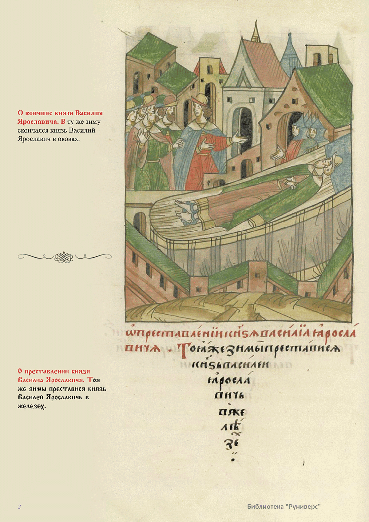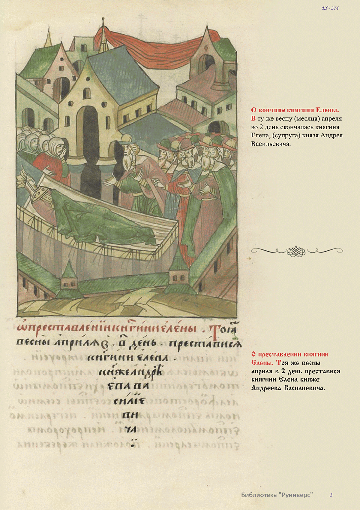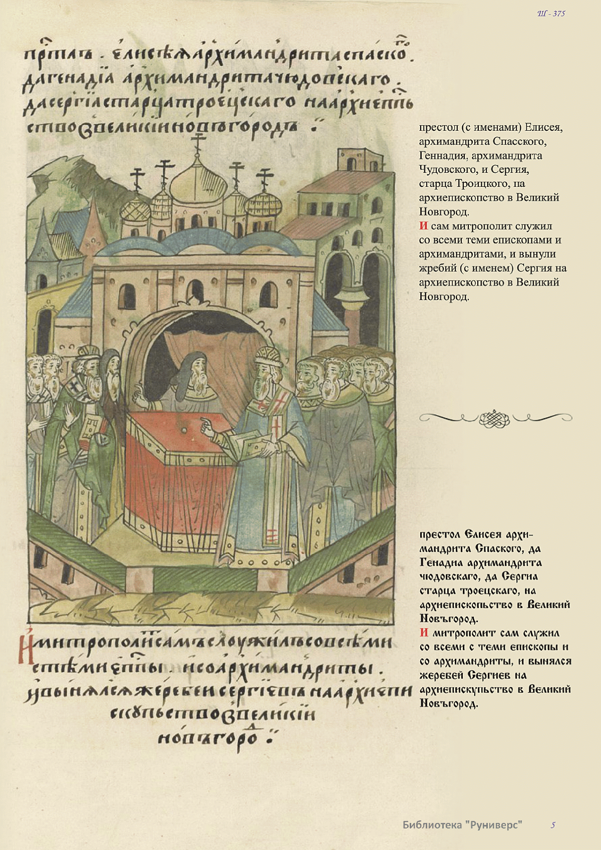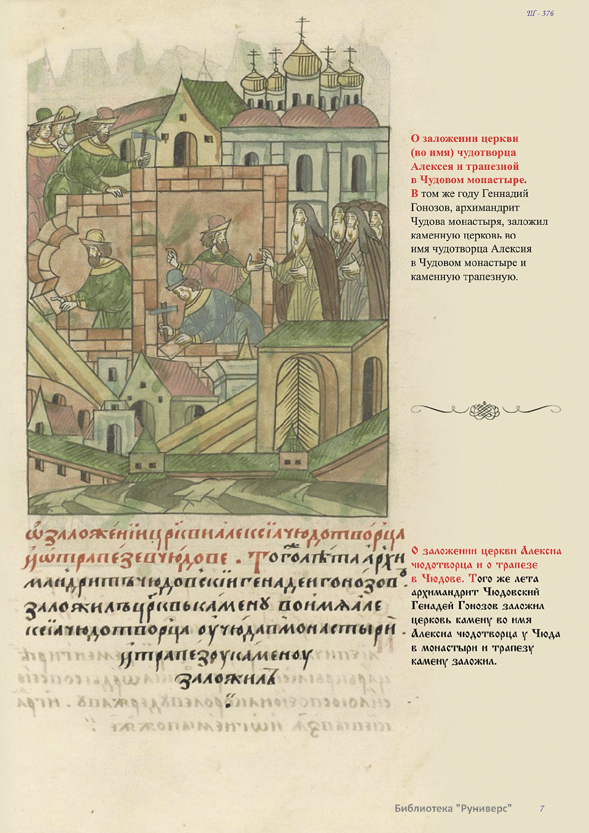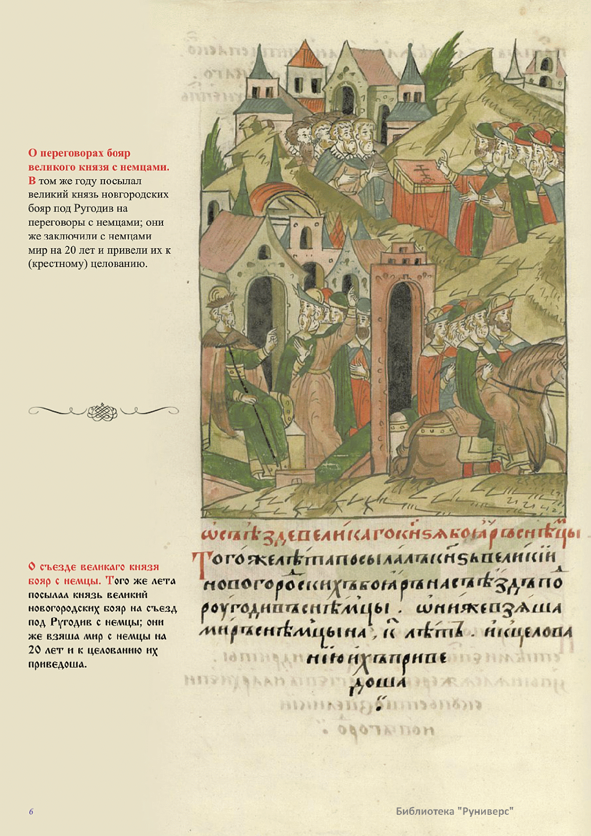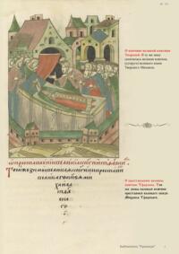 Лицевой летописный свод. XVI века — монументальный памятник древнерусского книжного искусства. На 10 тысячах листов с более чем 17 тысячами красочных миниатюр — «окон в историю» — представлена самая ранняя историческая и литературная энциклопедия. Лицевой свод дошел до наших дней в 10 томах, находящихся в разных древлехранилищах: БАН к РНБ в Санкт-Петербурге и ГИМ в Москве. Фирма «АКТЕОН» совместно с хранителями впервые осуществила научное факсимильное издание «Лицевой летописный свод XVI века». Предлагаемое издание с переводом — как дополнение в рамках научного аппарата вышеназванного факсимиле - представлено тремя разделами: библейская история, всемирная история, русская летописная история. В настоящем издании листы расположены в хронологическом порядке повествования На внешнем поле размещены транслитерация и перевод на современный русский язык. Русская летописная история 1114—1567 гг. — отражена на 6010 Лицевого летописного свода XVI века в следующих его томах: Г — Голицынский том (Отдел рукописей Российский национальной библиотеки, F.IV.225), Л — Лаптевский TOM (Отдел рукописей Российской национальной библиотеки, F.IV.233), O-I — Остермановский первый том (Отдел рукописей Библиотеки Академии наук, 31. 7. 30-1), O-II — Остермановский второй той (Отдел рукописей Библиотеки Академии наук, 31, 7. 30-2), Ш — Шумиловский том (Отдел рукописей Российской национальной библиотеки, F, IY. 232), С — Синодальный том (Отдел рукописей Государственного Исторического музея. Син. № 962), Ц— Царственная книга (Отдел рукописей Государственного Историческою музея. Син. № 149). В сносках отряжены разночтения с перепей ПСРЛ — Полным собранием русских летописей - фундаментальной для изучения истории древней и средневековой Руси книжной серией (её тексты, в основном, издавались наборно, в орфографии XIX века).