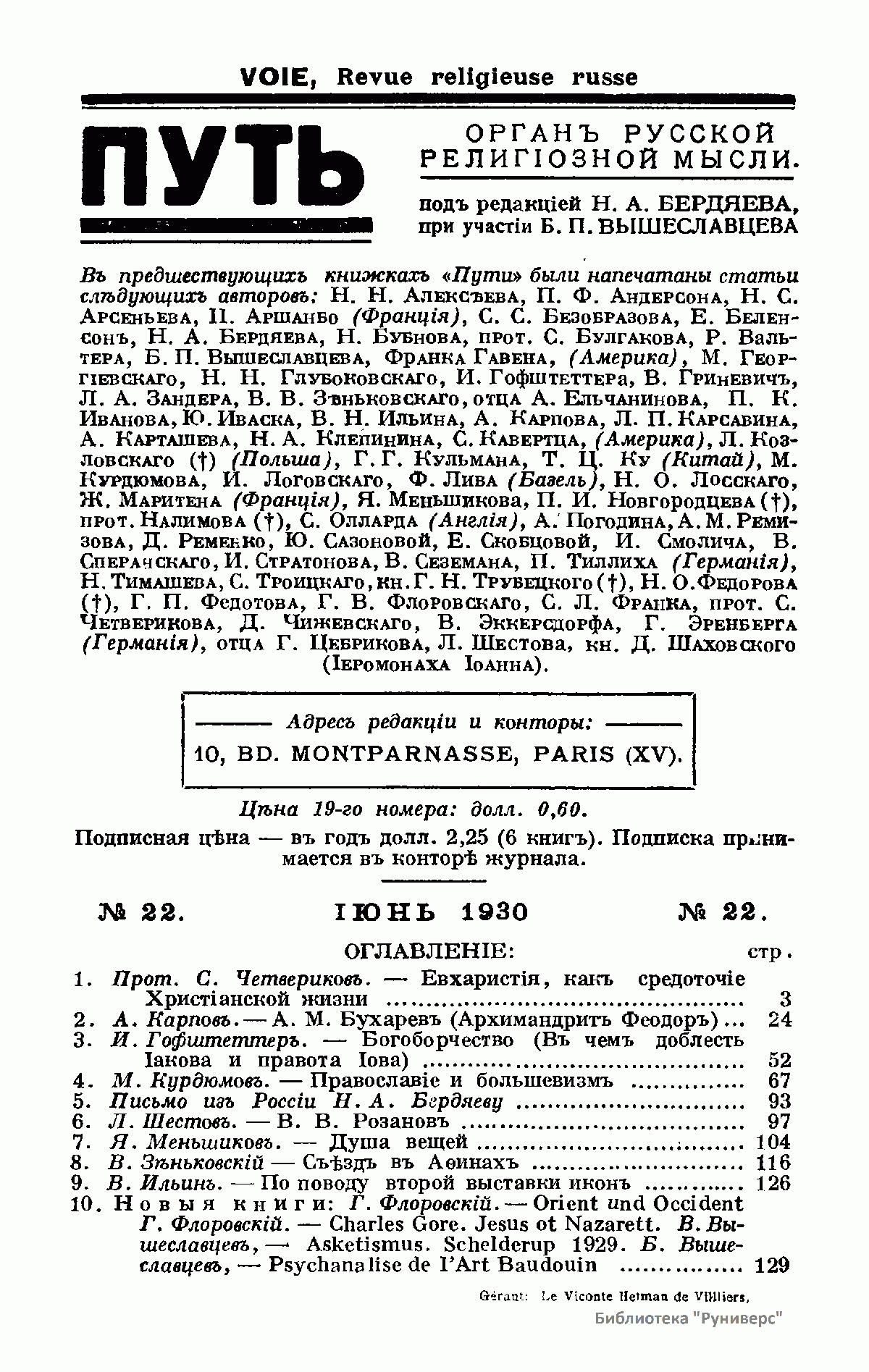 Путь: Орган русской религиозной мысли. №22. Июнь 1930