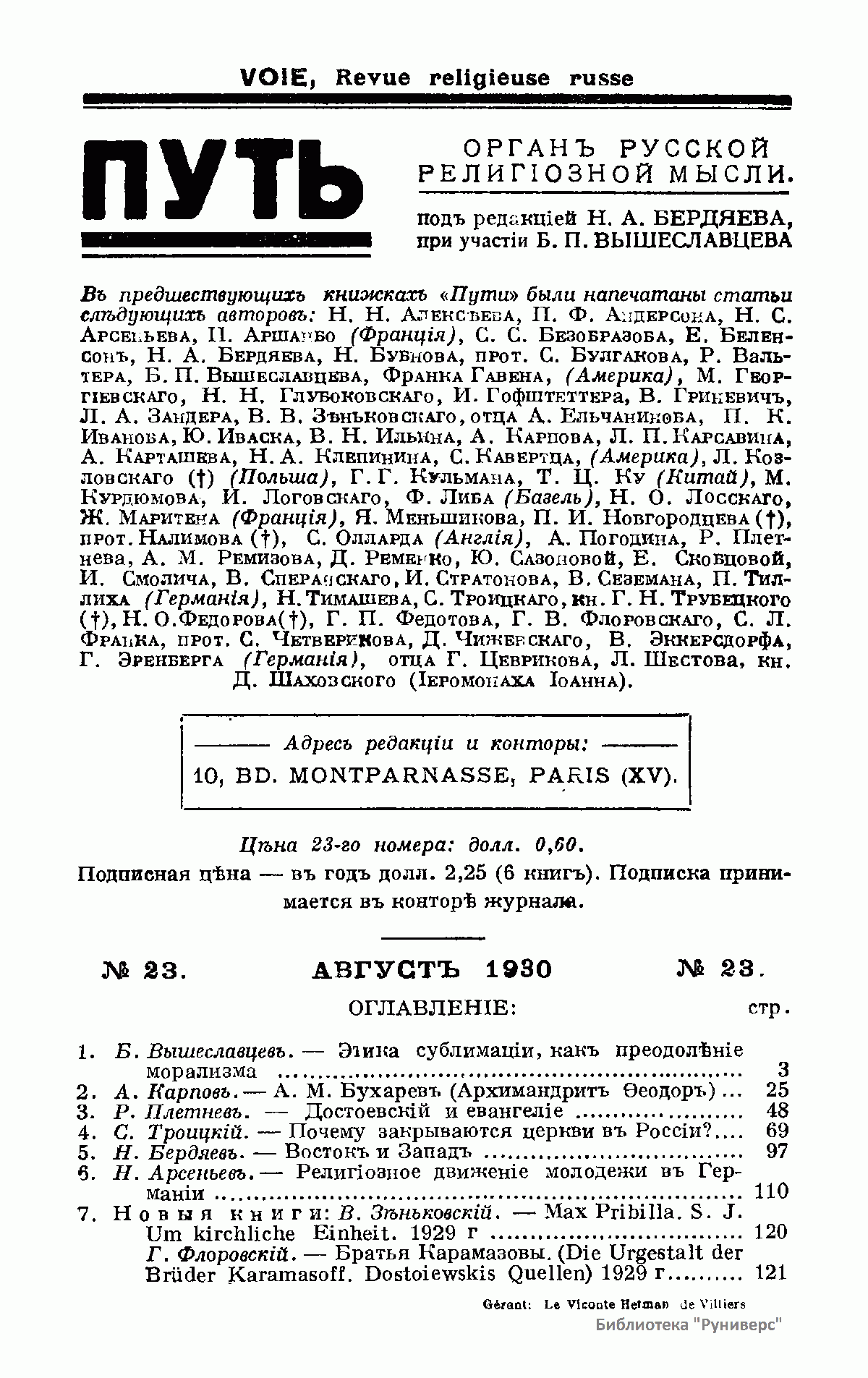Путь: Орган русской религиозной мысли. №23. Август 1930