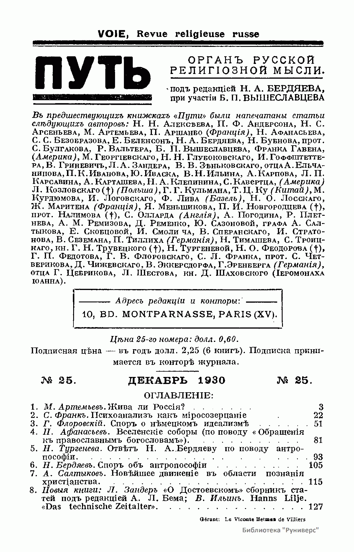 Путь: Орган русской религиозной мысли. №25. Декабрь 1930