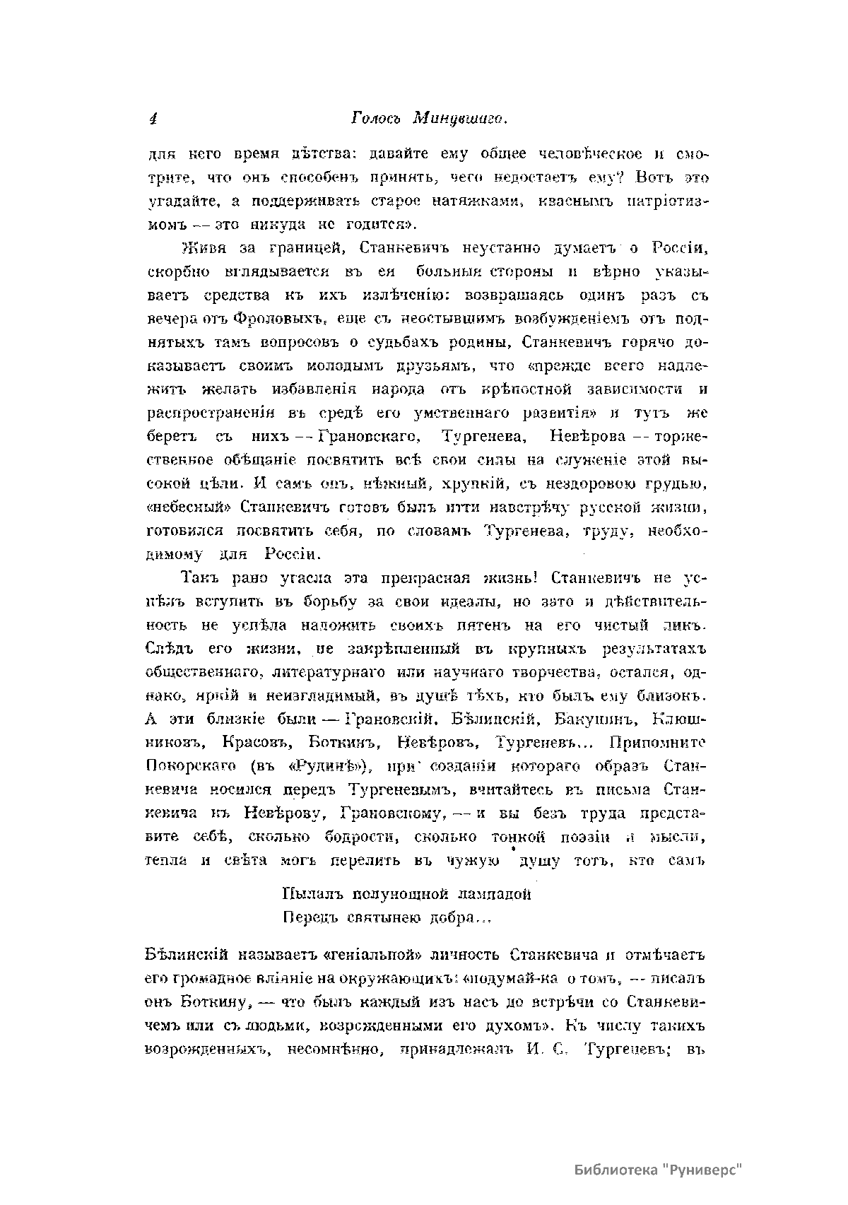 «Голос Минувшего» — журнал истории и истории литературы либерально-народнического направления, издававшийся в Москве с 1913 по 1923 год. Издателем журнала в 1913–1922 годах были известные русские историки, публицисты и общественные деятели С. П. Мельгунов (1880–1956) и В. И. Семевский (1848–1916). В редакционную коллегию также входили А. К. Дживелегов и П. Н. Сакулин. До 1919 «Голос минувшего» выходил ежемесячно, затем нерегулярно, всего было выпущено 65 номеров. В журнале публиковались интереснейшие материалы, посвященные истории литературы и общественных движений в России второй половины XVIII – начала XX веков. Здесь можно найти: статьи по вопросам русской и всеобщей истории, истории литературы, философии, искусства и археологии. В издании представлены: историческая беллетристика, биографии русских и иностранных деятелей, критика и библиография, новости русской и иностранной науки, обзор журналов русских и иностранных, хроника, мемуары, записки, дневники и письма декабристов, видных народовольцев и эсеров, крупных общественных деятелей и царских администраторов, писателей, военачальников и др. Среди авторов: Е. В. Тарле, А. Ф. Кони, А. К. Дживелегов, А. А. Кизеветтер, В. Г. Короленко и др. Стремление сделать журнал интересным для более широкого круга читателей способствовало тому, что в «Голосе Минувшего», хоть и в ограниченном количестве, печатались статьи по истории искусства и помещались иллюстрации: портреты, картины и рисунки, не знакомые или мало знакомые публике. В журнале опубликован целый ряд интересных писем, документов и воспоминаний. Абсолютное большинство текстов никогда не переиздавалось. Журнал снабжен указателями имен за 1913–1922 годы и систематическим указателем содержания.