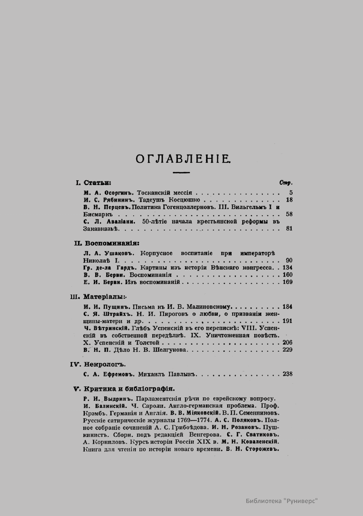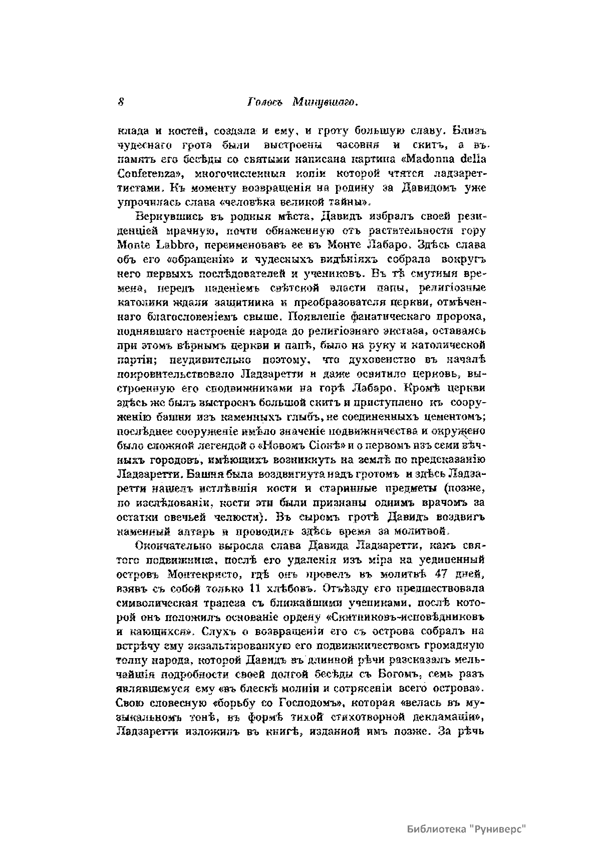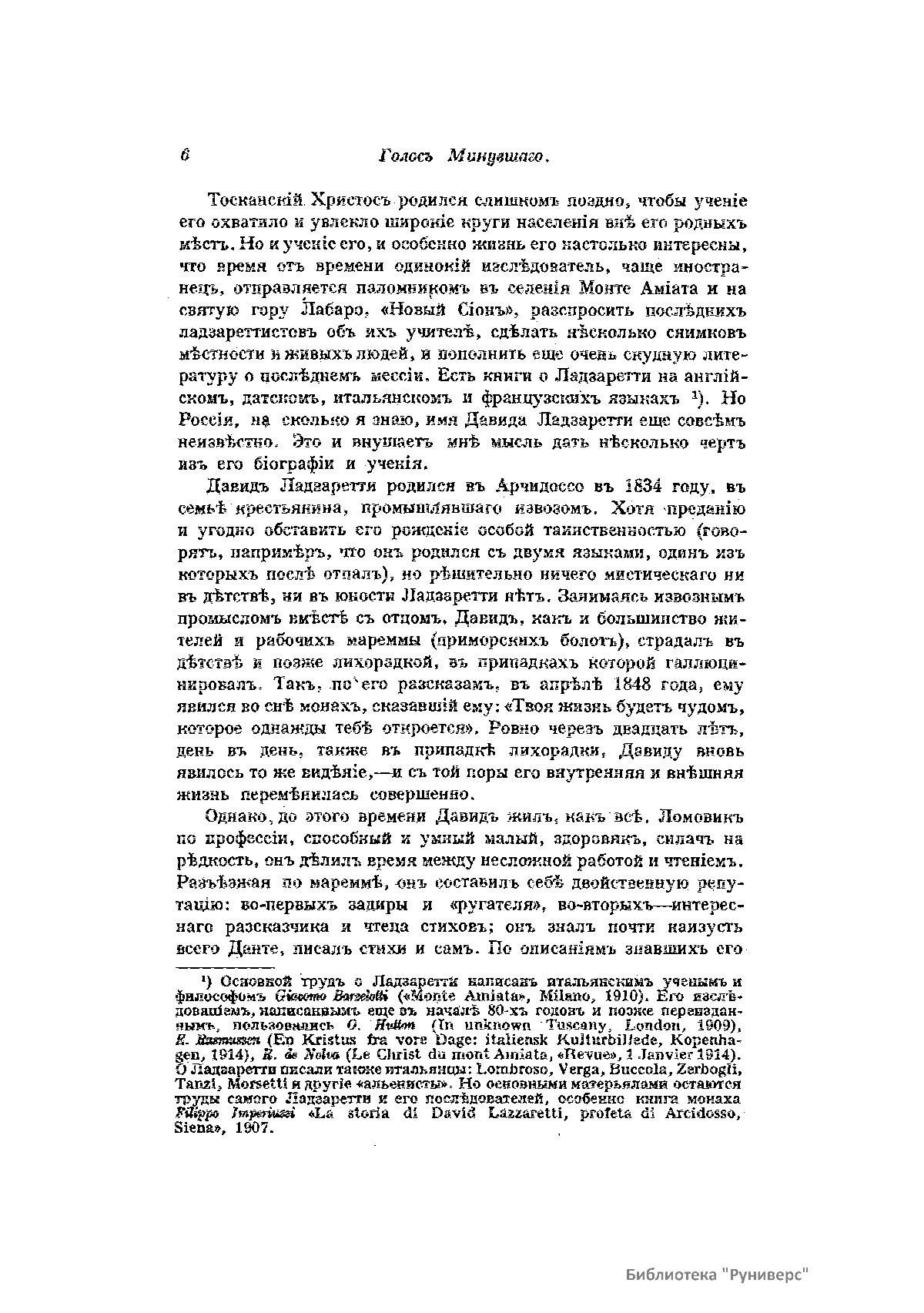 «Голос Минувшего» — журнал истории и истории литературы либерально-народнического направления, издававшийся в Москве с 1913 по 1923 год. Издателем журнала в 1913–1922 годах были известные русские историки, публицисты и общественные деятели С. П. Мельгунов (1880–1956) и В. И. Семевский (1848–1916). В редакционную коллегию также входили А. К. Дживелегов и П. Н. Сакулин. До 1919 «Голос минувшего» выходил ежемесячно, затем нерегулярно, всего было выпущено 65 номеров. В журнале публиковались интереснейшие материалы, посвященные истории литературы и общественных движений в России второй половины XVIII – начала XX веков. Здесь можно найти: статьи по вопросам русской и всеобщей истории, истории литературы, философии, искусства и археологии. В издании представлены: историческая беллетристика, биографии русских и иностранных деятелей, критика и библиография, новости русской и иностранной науки, обзор журналов русских и иностранных, хроника, мемуары, записки, дневники и письма декабристов, видных народовольцев и эсеров, крупных общественных деятелей и царских администраторов, писателей, военачальников и др. Среди авторов: Е. В. Тарле, А. Ф. Кони, А. К. Дживелегов, А. А. Кизеветтер, В. Г. Короленко и др. Стремление сделать журнал интересным для более широкого круга читателей способствовало тому, что в «Голосе Минувшего», хоть и в ограниченном количестве, печатались статьи по истории искусства и помещались иллюстрации: портреты, картины и рисунки, не знакомые или мало знакомые публике. В журнале опубликован целый ряд интересных писем, документов и воспоминаний. Абсолютное большинство текстов никогда не переиздавалось. Журнал снабжен указателями имен за 1913–1922 годы и систематическим указателем содержания.