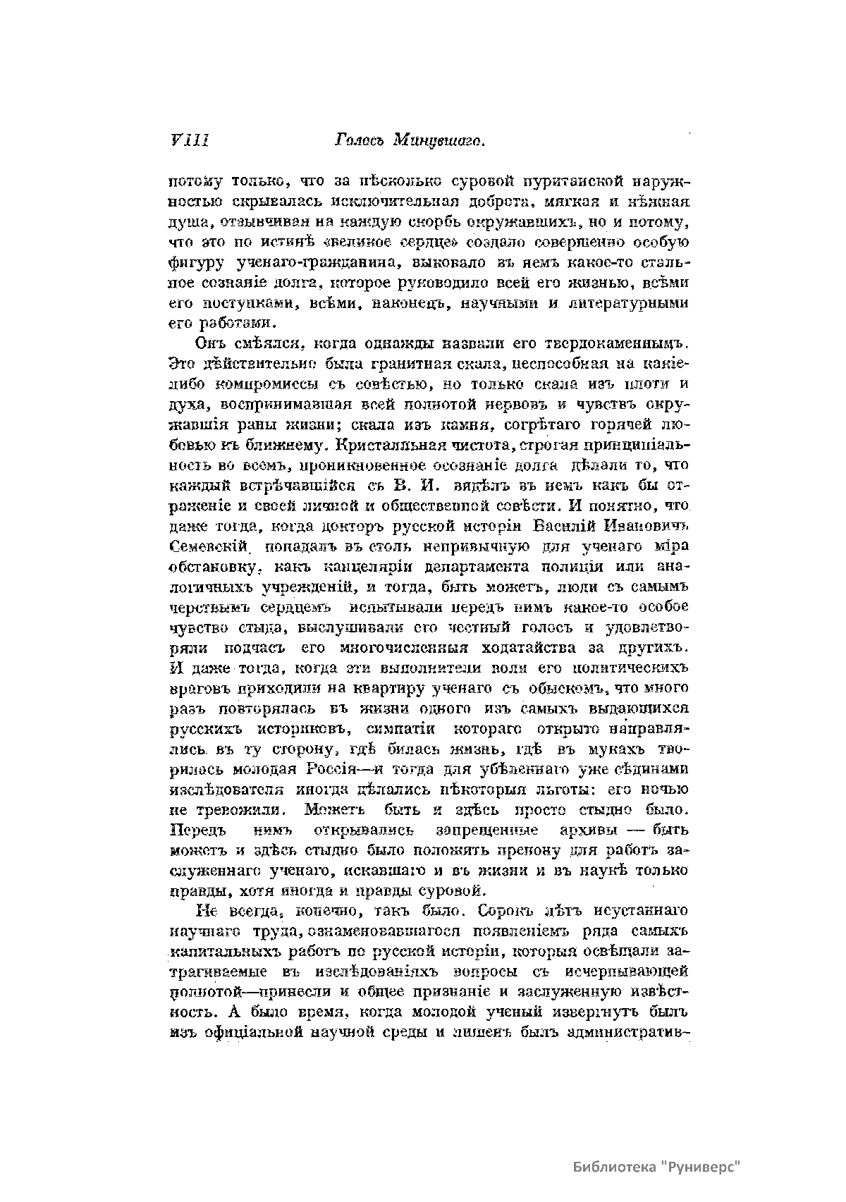 «Голос Минувшего» — журнал истории и истории литературы либерально-народнического направления, издававшийся в Москве с 1913 по 1923 год. Издателем журнала в 1913–1922 годах были известные русские историки, публицисты и общественные деятели С. П. Мельгунов (1880–1956) и В. И. Семевский (1848–1916). В редакционную коллегию также входили А. К. Дживелегов и П. Н. Сакулин. До 1919 «Голос минувшего» выходил ежемесячно, затем нерегулярно, всего было выпущено 65 номеров. В журнале публиковались интереснейшие материалы, посвященные истории литературы и общественных движений в России второй половины XVIII – начала XX веков. Здесь можно найти: статьи по вопросам русской и всеобщей истории, истории литературы, философии, искусства и археологии. В издании представлены: историческая беллетристика, биографии русских и иностранных деятелей, критика и библиография, новости русской и иностранной науки, обзор журналов русских и иностранных, хроника, мемуары, записки, дневники и письма декабристов, видных народовольцев и эсеров, крупных общественных деятелей и царских администраторов, писателей, военачальников и др. Среди авторов: Е. В. Тарле, А. Ф. Кони, А. К. Дживелегов, А. А. Кизеветтер, В. Г. Короленко и др. Стремление сделать журнал интересным для более широкого круга читателей способствовало тому, что в «Голосе Минувшего», хоть и в ограниченном количестве, печатались статьи по истории искусства и помещались иллюстрации: портреты, картины и рисунки, не знакомые или мало знакомые публике. В журнале опубликован целый ряд интересных писем, документов и воспоминаний. Абсолютное большинство текстов никогда не переиздавалось. Журнал снабжен указателями имен за 1913–1922 годы и систематическим указателем содержания.