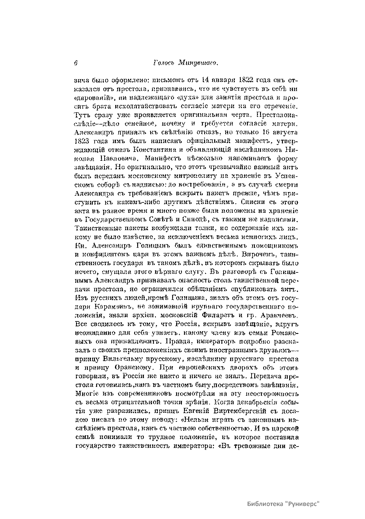 «Голос Минувшего» — журнал истории и истории литературы либерально-народнического направления, издававшийся в Москве с 1913 по 1923 год. Издателем журнала в 1913–1922 годах были известные русские историки, публицисты и общественные деятели С. П. Мельгунов (1880–1956) и В. И. Семевский (1848–1916). В редакционную коллегию также входили А. К. Дживелегов и П. Н. Сакулин. До 1919 «Голос минувшего» выходил ежемесячно, затем нерегулярно, всего было выпущено 65 номеров. В журнале публиковались интереснейшие материалы, посвященные истории литературы и общественных движений в России второй половины XVIII – начала XX веков. Здесь можно найти: статьи по вопросам русской и всеобщей истории, истории литературы, философии, искусства и археологии. В издании представлены: историческая беллетристика, биографии русских и иностранных деятелей, критика и библиография, новости русской и иностранной науки, обзор журналов русских и иностранных, хроника, мемуары, записки, дневники и письма декабристов, видных народовольцев и эсеров, крупных общественных деятелей и царских администраторов, писателей, военачальников и др. Среди авторов: Е. В. Тарле, А. Ф. Кони, А. К. Дживелегов, А. А. Кизеветтер, В. Г. Короленко и др. Стремление сделать журнал интересным для более широкого круга читателей способствовало тому, что в «Голосе Минувшего», хоть и в ограниченном количестве, печатались статьи по истории искусства и помещались иллюстрации: портреты, картины и рисунки, не знакомые или мало знакомые публике. В журнале опубликован целый ряд интересных писем, документов и воспоминаний. Абсолютное большинство текстов никогда не переиздавалось. Журнал снабжен указателями имен за 1913–1922 годы и систематическим указателем содержания.