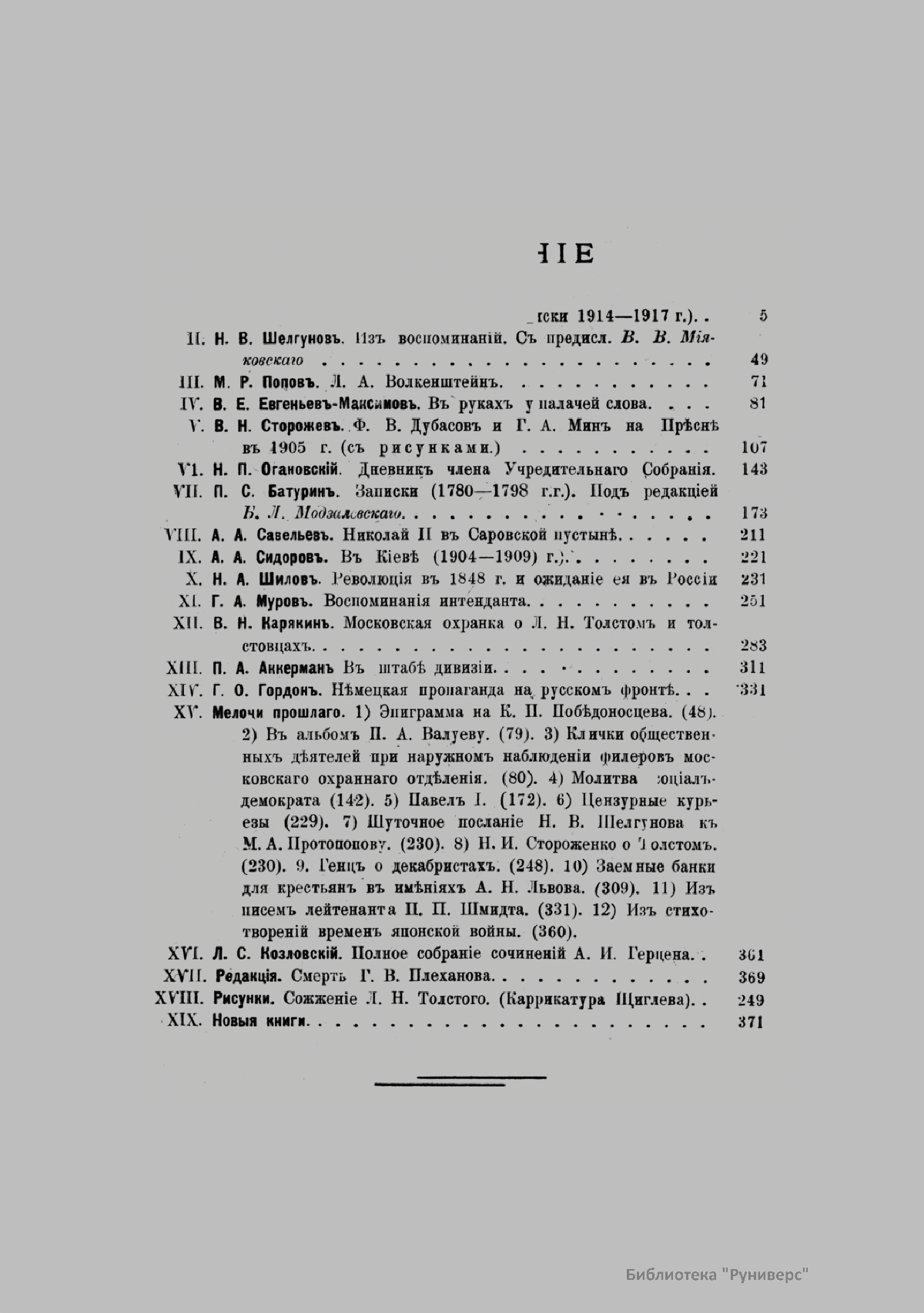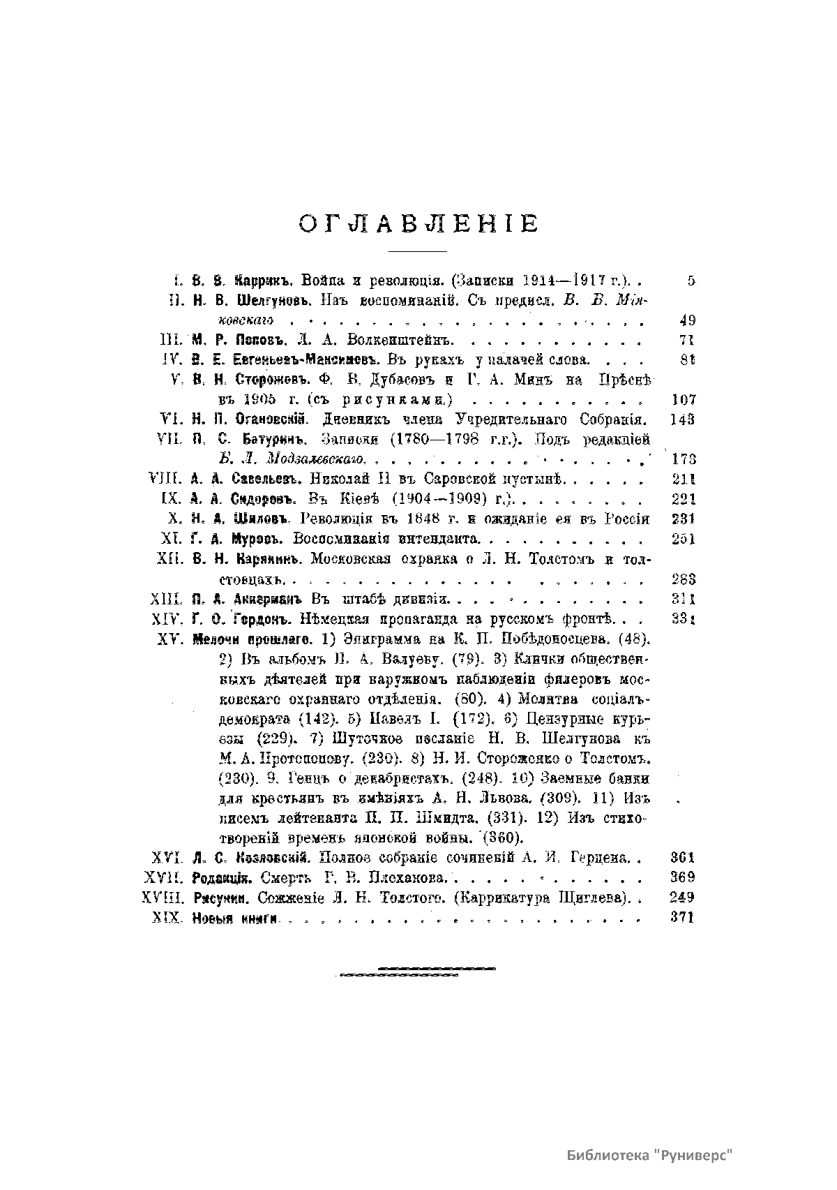 «Голос Минувшего» — журнал истории и истории литературы либерально-народнического направления, издававшийся в Москве с 1913 по 1923 год. Издателем журнала в 1913–1922 годах были известные русские историки, публицисты и общественные деятели С. П. Мельгунов (1880–1956) и В. И. Семевский (1848–1916). В редакционную коллегию также входили А. К. Дживелегов и П. Н. Сакулин. До 1919 «Голос минувшего» выходил ежемесячно, затем нерегулярно, всего было выпущено 65 номеров. В журнале публиковались интереснейшие материалы, посвященные истории литературы и общественных движений в России второй половины XVIII – начала XX веков. Здесь можно найти: статьи по вопросам русской и всеобщей истории, истории литературы, философии, искусства и археологии. В издании представлены: историческая беллетристика, биографии русских и иностранных деятелей, критика и библиография, новости русской и иностранной науки, обзор журналов русских и иностранных, хроника, мемуары, записки, дневники и письма декабристов, видных народовольцев и эсеров, крупных общественных деятелей и царских администраторов, писателей, военачальников и др. Среди авторов: Е. В. Тарле, А. Ф. Кони, А. К. Дживелегов, А. А. Кизеветтер, В. Г. Короленко и др. Стремление сделать журнал интересным для более широкого круга читателей способствовало тому, что в «Голосе Минувшего», хоть и в ограниченном количестве, печатались статьи по истории искусства и помещались иллюстрации: портреты, картины и рисунки, не знакомые или мало знакомые публике. В журнале опубликован целый ряд интересных писем, документов и воспоминаний. Абсолютное большинство текстов никогда не переиздавалось. Журнал снабжен указателями имен за 1913–1922 годы и систематическим указателем содержания.