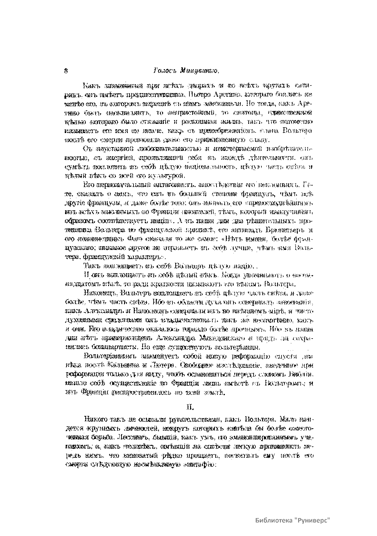 «Голос Минувшего» — журнал истории и истории литературы либерально-народнического направления, издававшийся в Москве с 1913 по 1923 год. Издателем журнала в 1913–1922 годах были известные русские историки, публицисты и общественные деятели С. П. Мельгунов (1880–1956) и В. И. Семевский (1848–1916). В редакционную коллегию также входили А. К. Дживелегов и П. Н. Сакулин. До 1919 «Голос минувшего» выходил ежемесячно, затем нерегулярно, всего было выпущено 65 номеров. В журнале публиковались интереснейшие материалы, посвященные истории литературы и общественных движений в России второй половины XVIII – начала XX веков. Здесь можно найти: статьи по вопросам русской и всеобщей истории, истории литературы, философии, искусства и археологии. В издании представлены: историческая беллетристика, биографии русских и иностранных деятелей, критика и библиография, новости русской и иностранной науки, обзор журналов русских и иностранных, хроника, мемуары, записки, дневники и письма декабристов, видных народовольцев и эсеров, крупных общественных деятелей и царских администраторов, писателей, военачальников и др. Среди авторов: Е. В. Тарле, А. Ф. Кони, А. К. Дживелегов, А. А. Кизеветтер, В. Г. Короленко и др. Стремление сделать журнал интересным для более широкого круга читателей способствовало тому, что в «Голосе Минувшего», хоть и в ограниченном количестве, печатались статьи по истории искусства и помещались иллюстрации: портреты, картины и рисунки, не знакомые или мало знакомые публике. В журнале опубликован целый ряд интересных писем, документов и воспоминаний. Абсолютное большинство текстов никогда не переиздавалось. Журнал снабжен указателями имен за 1913–1922 годы и систематическим указателем содержания.