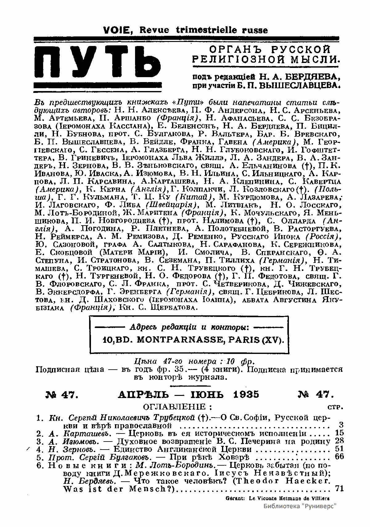Путь: Орган русской религиозной мысли. №47. Апрель-Июнь 1935