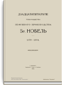 Издание, приуроченное к 25-летию деятельности нефтепромышленников Нобелей, описывает историю возникновения и развития «Товарищества нефтяного производства». Книга повествует о роли компании Нобелей в развитии русской нефтяной промышленности, о ее организации (промыслы, хранилища, нефтепроводы, ассортимент нефтяных продуктов, склады, персонал, сотрудники), итогах 25-летней деятельности. Издание содержит множество иллюстративного материала. Семья шведских техников и промышленников Нобелей (Nobel) известна в России с 1837 г., когда в Санкт-Петербург с образцами изобретенных им мин прибыл Эммануил Нобель (1801–1872) — основатель завода по производству подводных мин. Нефтепромышленную фирму «Товарищество нефтяного производства братьев Нобель» в 1879 г. учредили его сыновья — Людвиг, Роберт и Альфред Эммануиловичи и их друг, полковник гвардейской артиллерии (впоследствии генерал, барон) Петр Александрович Бильдерлинг. Компания вела нефтедобычу и нефтепереработку в Баку и Челекене, создала собственную транспортную компанию и сбытовую сеть. На счету компании Нобелей многие коммерческие и инженерные начинания: первые в мире цилиндрические суда-нефтехранилища, первый в мире дизель-электроход, первые российские нефтеналивные суда и нефтепровод, разработка и внедрение в России ранее практически отсутствующих вагонов-цистерн.