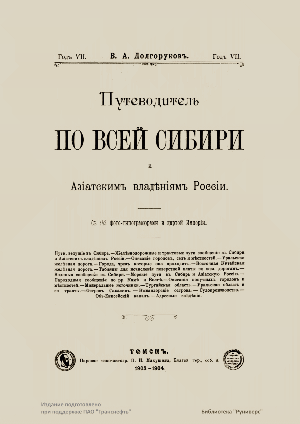 Путеводитель по всей Сибири и Азиатским владениям России» — справочное издание, составленное одним из представителей древнейшего дворянского рода Всеволодом Алексеевичем Долгоруковым (1845–1912). Путешественники и исследователи этого края могут найти все необходимые сведения о городах и отдельных местностях, о путях сообщения, торговых и караванных путях, минеральных источниках Азиатской России, судопроизводстве, Енисейском канале, Уральской железной дороге, острове Сахалине, Командорских островах. Для наглядности были выполнены фото-типогравюры с портретами, видами местностей, зданий, гербов. В качестве приложения даны адресные и календарные сведения. Для удобства пользования книгой, автором был составлен географо-именной указатель, а также список фирм, поместивших рекламу в издании.
