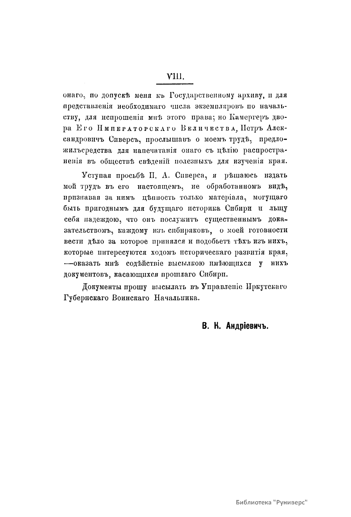 В 1883–1885 гг. были опубликованы подготовленные В. К. Андриевичем «Материалы для статистики населения в Забайкальском казачьем войске». Желание снабдить это издание очерком истории Забайкалья привело автора к изучению сибирской истории вообще. В результате исследовательской работы на данную тему вышли в свет сочинения: «Краткий очерк истории Забайкалья от древнейших времен до 1762 года» и «Исторический очерк Сибири». Отдельные тома последнего издания выходили в свет не по порядку. Сначала в Иркутске в 1886 г. был напечатан второй том, охватывающий события 1700–1742 гг. Третий том (события 1742–1762 гг.) вышел в Томске в 1887 г., в этом же году в Петербурге увидел свет четвертый том (Екатерининская эпоха). Пятый том из-за недоразумений с сибирскими типографиями был напечатан дважды — в Красноярске и Одессе (1888). В Очакове Андриевич составил древнейшую историю Сибири (своевременно не вышедшая первая часть сочинения) и переработал вторую часть издания, включив в нее период от 1660 до 1741 г., в результате чего ранее вышедшая вторая часть оказалась излишней. Эти две части стали отдельным изданием —