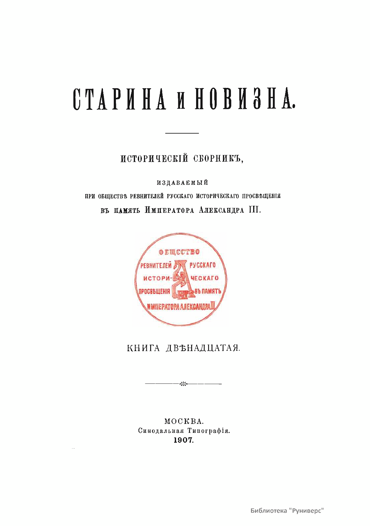 «Старина и новизна» — русский исторический сборник, издававшийся «Обществом ревнителей русского исторического просвещения в память императора Александра III». Сборник выходил в Петербурге в 1897–1904 и в Москве в 1904–1917 годах по мере накопления материала. Руководил изданием сборника граф С. Д. Шереметев (1844–1918) — историк, археолог, председатель «Общества», одного из первых объединений историков монархического направления. Члены общества способствовали изданию документов прошлого, содействуя развитию исторической науки и популяризации интереса к историческим материалам. «Старина и новизна» представляет собой собрание документальных материалов по русской истории и литературе XVII–XIX века. Вместе с Шереметевым в создании сборника участвовали блестящие историки А. П. и Н. П. Барсуковы, С. Ф. Платонов, Л. П. Майков и др.