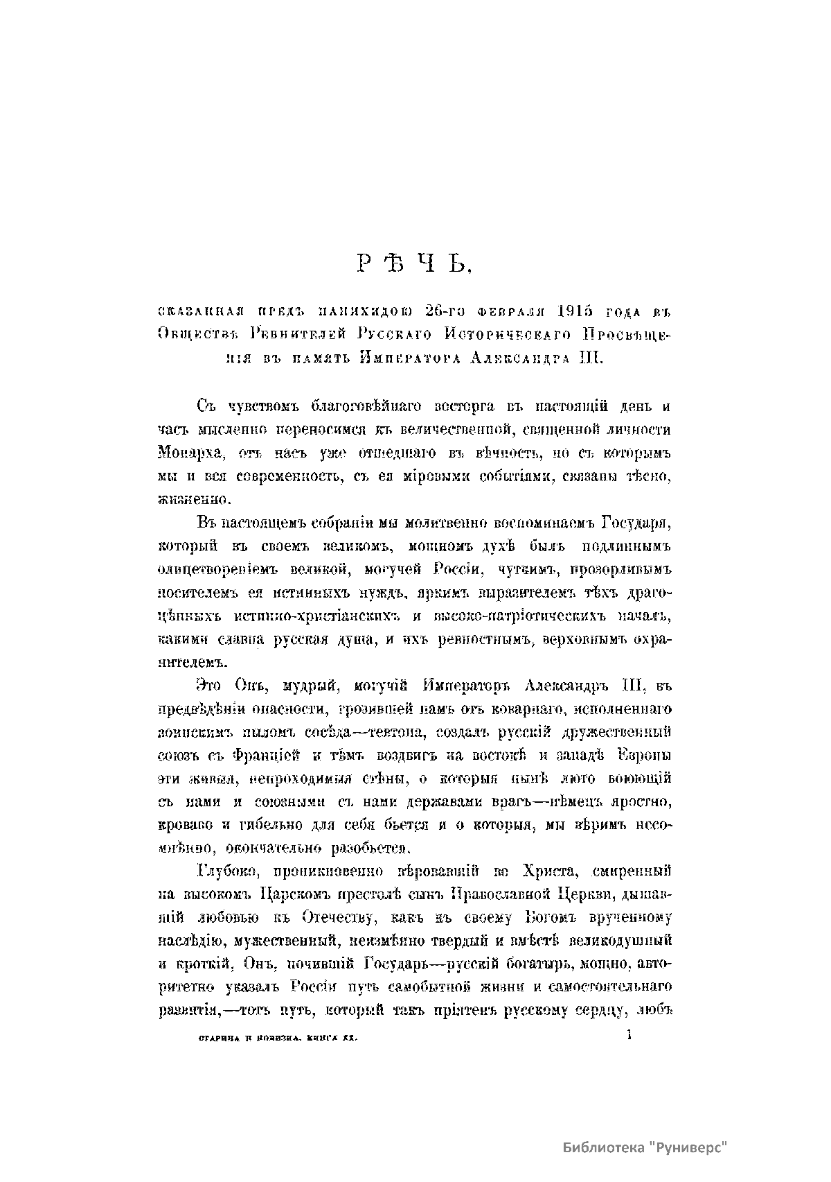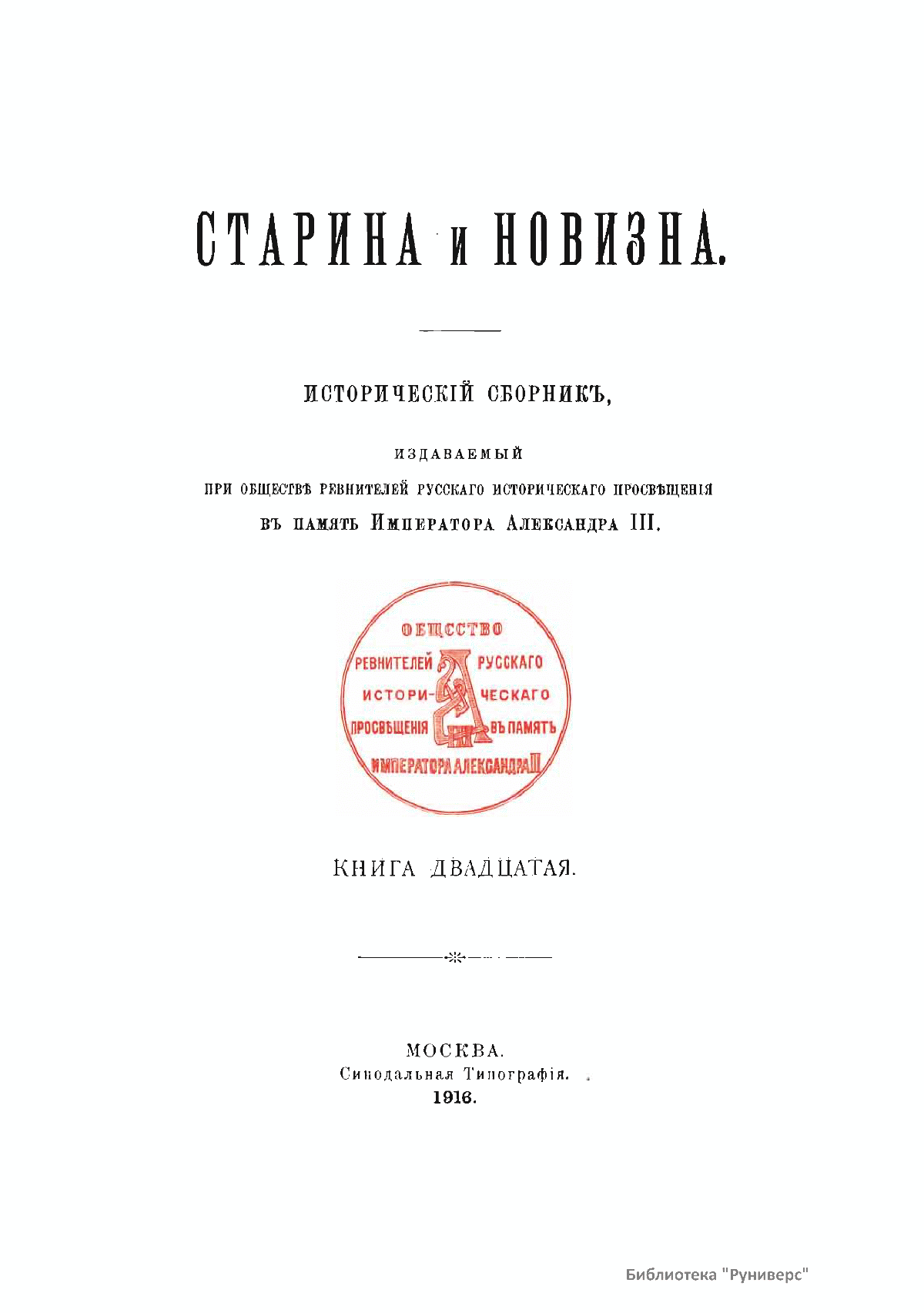 «Старина и новизна» — русский исторический сборник, издававшийся «Обществом ревнителей русского исторического просвещения в память императора Александра III». Сборник выходил в Петербурге в 1897–1904 и в Москве в 1904–1917 годах по мере накопления материала. Руководил изданием сборника граф С. Д. Шереметев (1844–1918) — историк, археолог, председатель «Общества», одного из первых объединений историков монархического направления. Члены общества способствовали изданию документов прошлого, содействуя развитию исторической науки и популяризации интереса к историческим материалам. «Старина и новизна» представляет собой собрание документальных материалов по русской истории и литературе XVII–XIX века. Вместе с Шереметевым в создании сборника участвовали блестящие историки А. П. и Н. П. Барсуковы, С. Ф. Платонов, Л. П. Майков и др.
