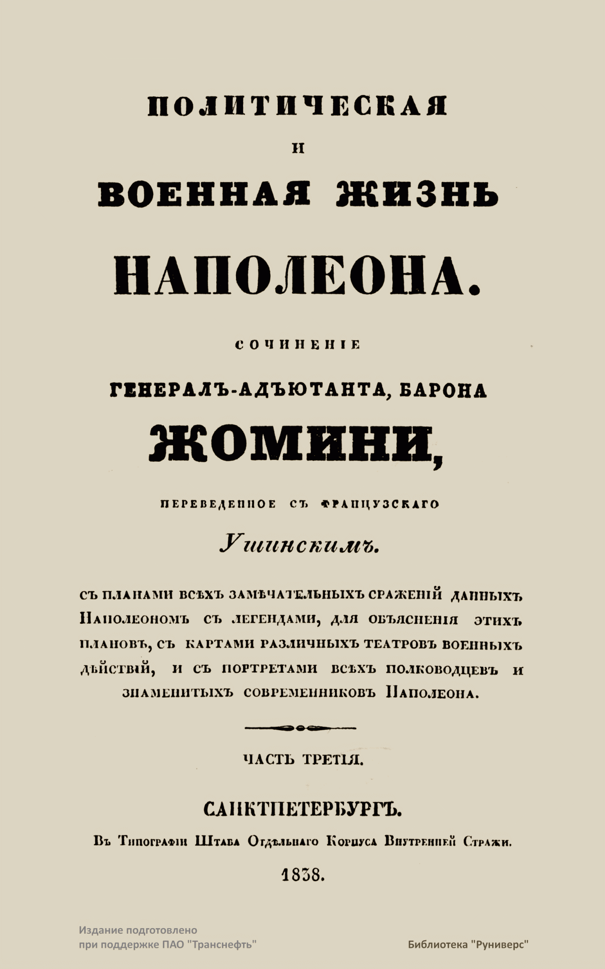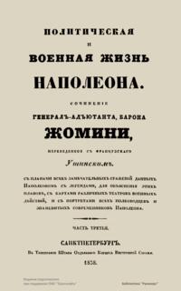 Русский перевод сочинения «Политическая и военная жизнь Наполеона» был сделан со знаменитой работы Жомини, изданной в Париже в 1827 г., — «Vie politique et militaire de Napoléon, racontée par lui-même au tribunal de César, d’Alexandre et de Frédéric» («Политическая и военная жизнь Наполеона, рассказанная им перед судом Цезаря, Александра и Фридриха»). Для данного труда Жомини избрал форму рассказа, который Наполеон ведет о своих походах. В основу этого повествования от первого лица лег, без сомнения, труд Э. О. де Лас Каза — секретаря Наполеона, записывавшего его мысли и воспоминания на острове Св. Елены, изданный в 1822–1823 гг. под названием «Mémorial de Sainte-Hélène» («Мемориал Святой Елены).