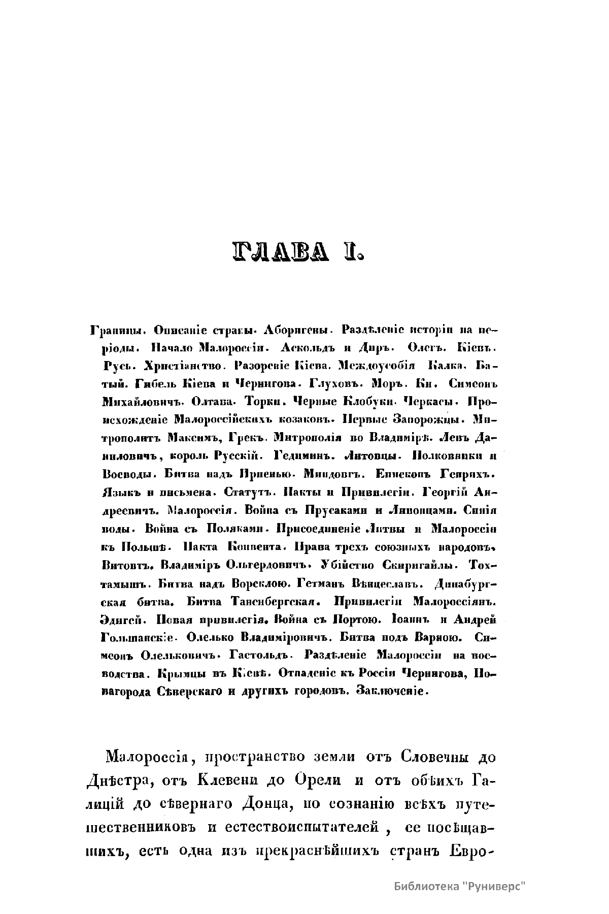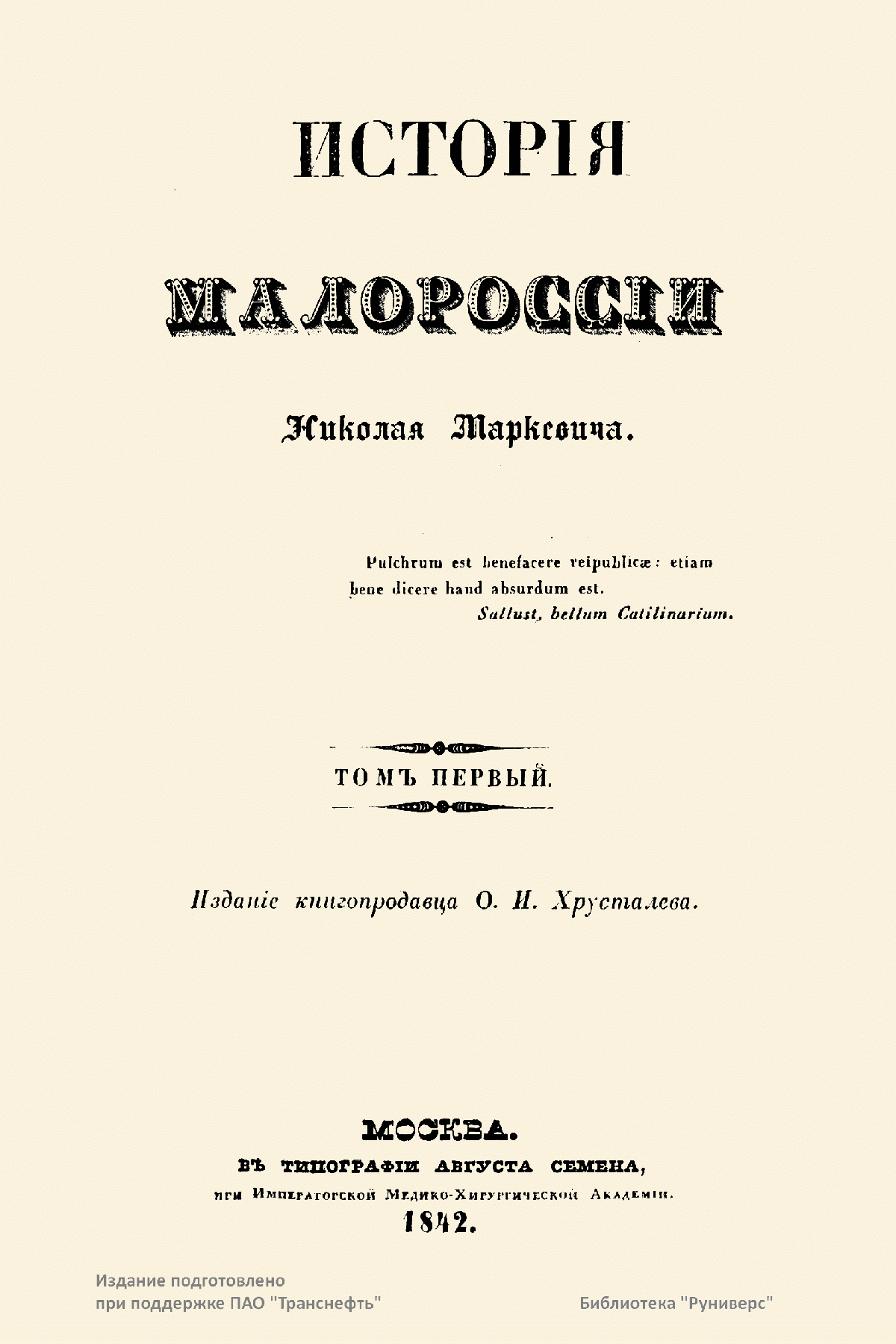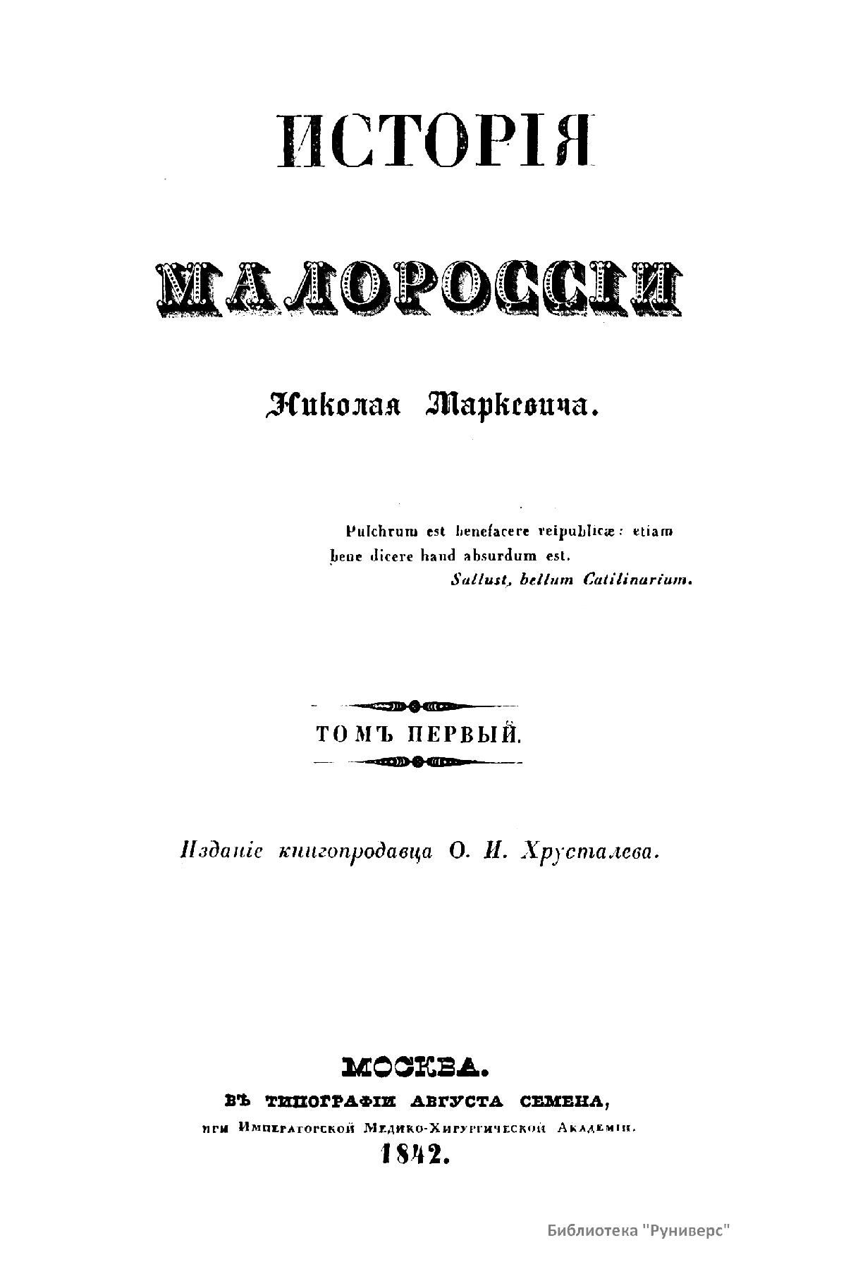 Первые два тома содержат основной текст — от древних времен до 1793 г., а 3–5 тома — документальные дополнения, примечания, хронологические таблицы, источники, указатели. Основным источником для книги послужила «История русов» (произведение, написанное в виде политического памфлета в конце XVIII–начале XIX века на территории Малороссии) почти не подкрепленная другими документальными свидетельствами. Тем не менее, книга имела большое влияние на современников Н. А. Маркевича, внесла свой вклад в украинскую историографию XIX века, а документальные приложения сохраняют свою историческую значимость и сегодня.